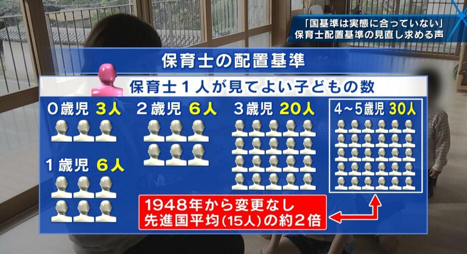 4歳から5歳児は1948年から70年以上一度も基準が変わっておらず、先進国平均のおよそ2倍となっています。おさなご保育園では国の基準以上の保育士を配置していますが、小西園長は特に1歳児の園児に対する配置が課題だと言います。