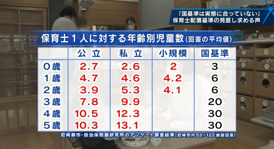 田近さんらは去年、尼崎市内の保育園などを対象に保育の実態を調べるアンケートを実施。その結果、多くの園で国の基準以上の保育士を配置している実態が明らかになりました。