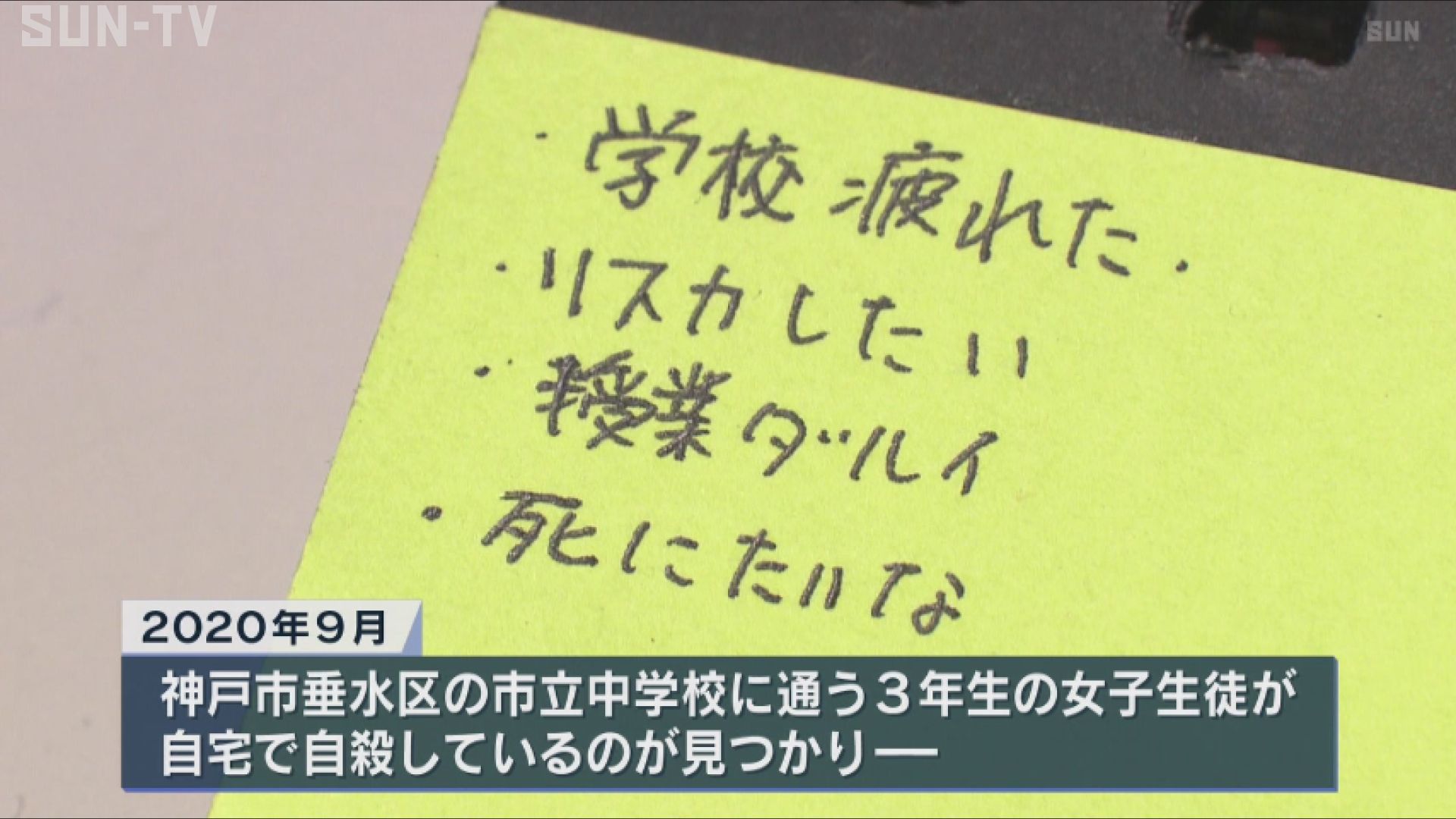 20年9月、神戸市垂水区の市立中学校に通う3年生の女子生徒が自宅で自殺しているのが見つかり、遺族の代理人弁護士によりますと部屋には「死にたい」などと書かれたメモや、同じ学年の女子生徒に宛てた手紙などが残されていたということです。
