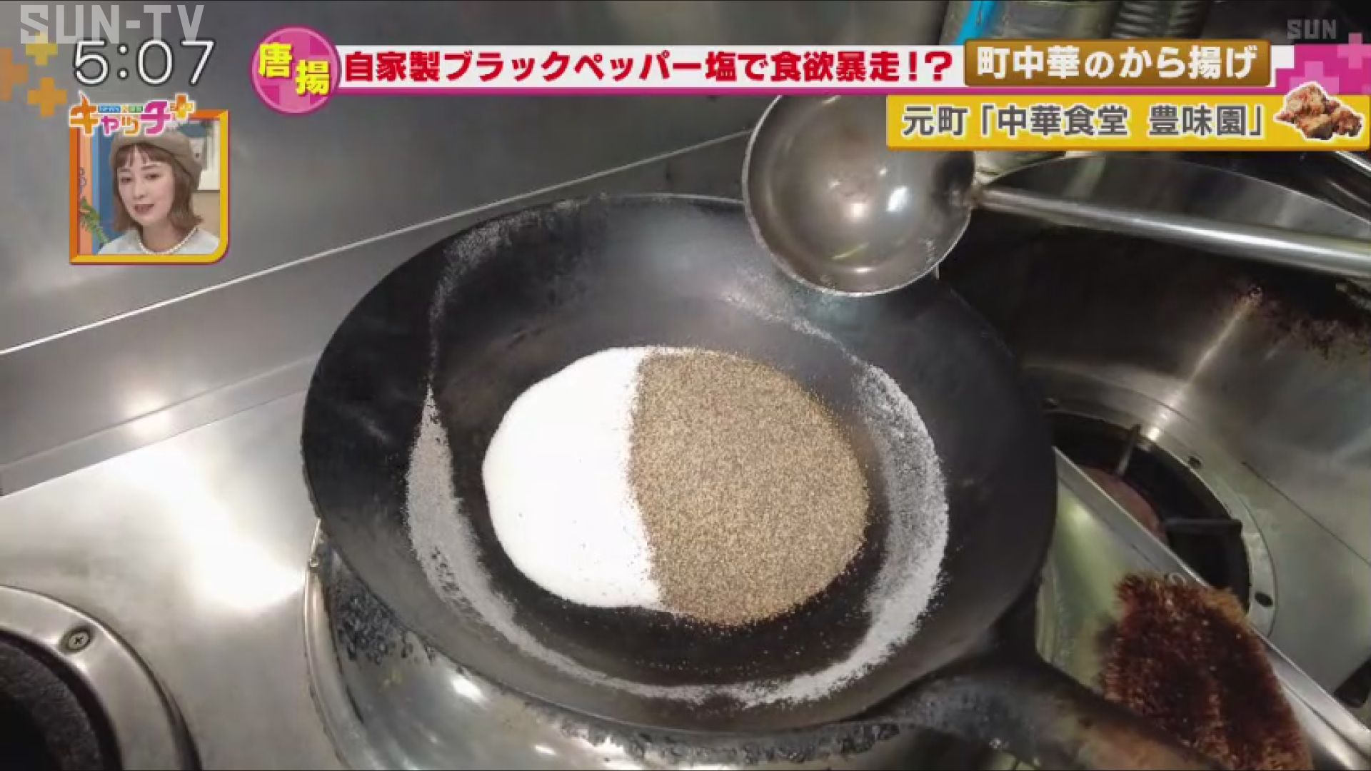 「ブラックペッパーの塩コショウを作ります。炒めることでブラックペッパーの匂いが出ています。もっとおいしくなります」