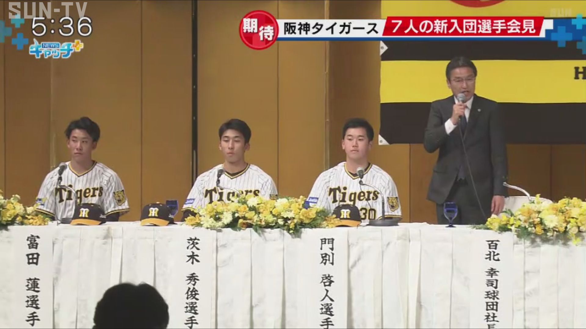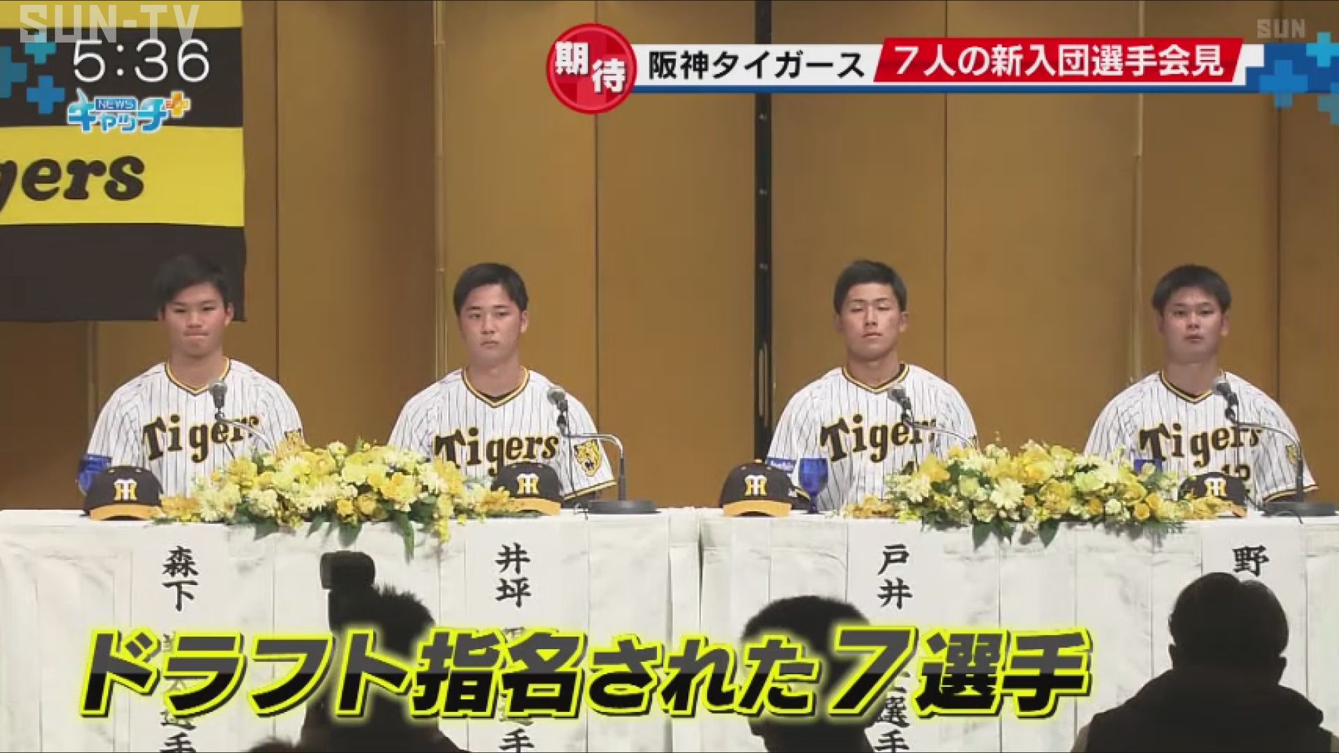 12日午後、大阪市内のホテルで開かれた新入団会見。来シーズンから指揮を執る岡田彰布監督らが同席し、ドラフト指名された新人7選手が意気込みを語りました。