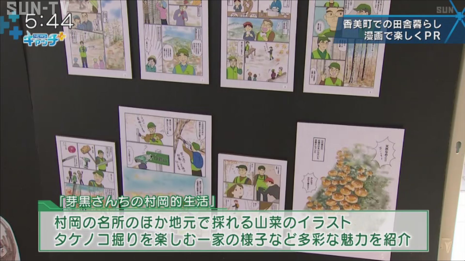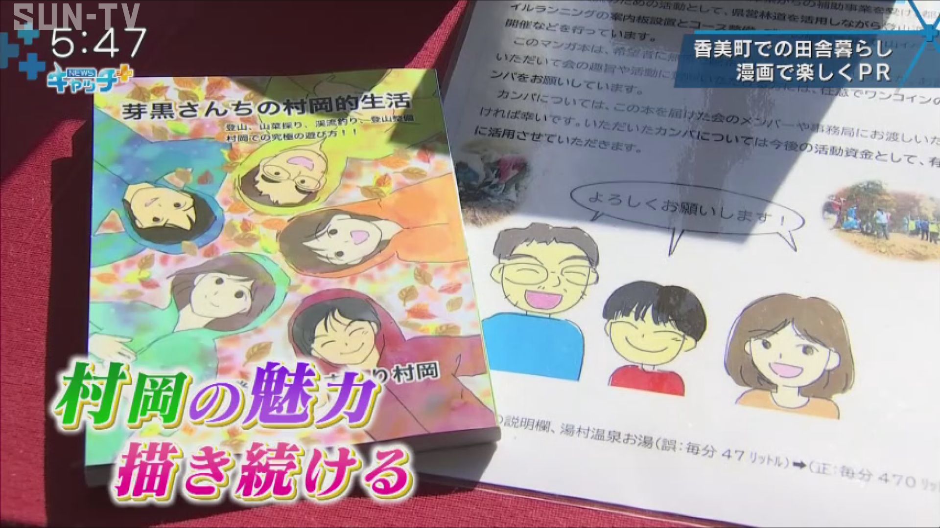 漫画のタイトルは「芽黒さんちの村岡的生活」。村岡の名所のほか、地元で採れる山菜やキノコのイラストに、タケノコ堀りを楽しむ一家の様子など、季節ごとの多彩な魅力を紹介しています。