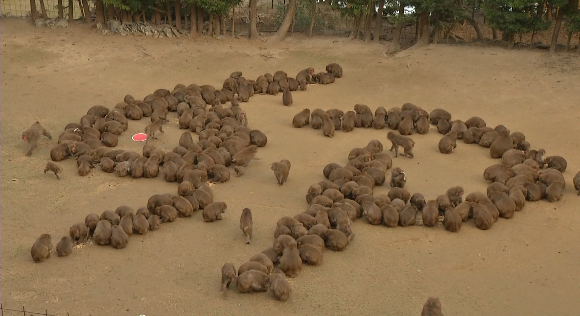 集まったサルたちは行儀よく整列して餌を食べ、来年の干支「卯」の文字を形作りました。