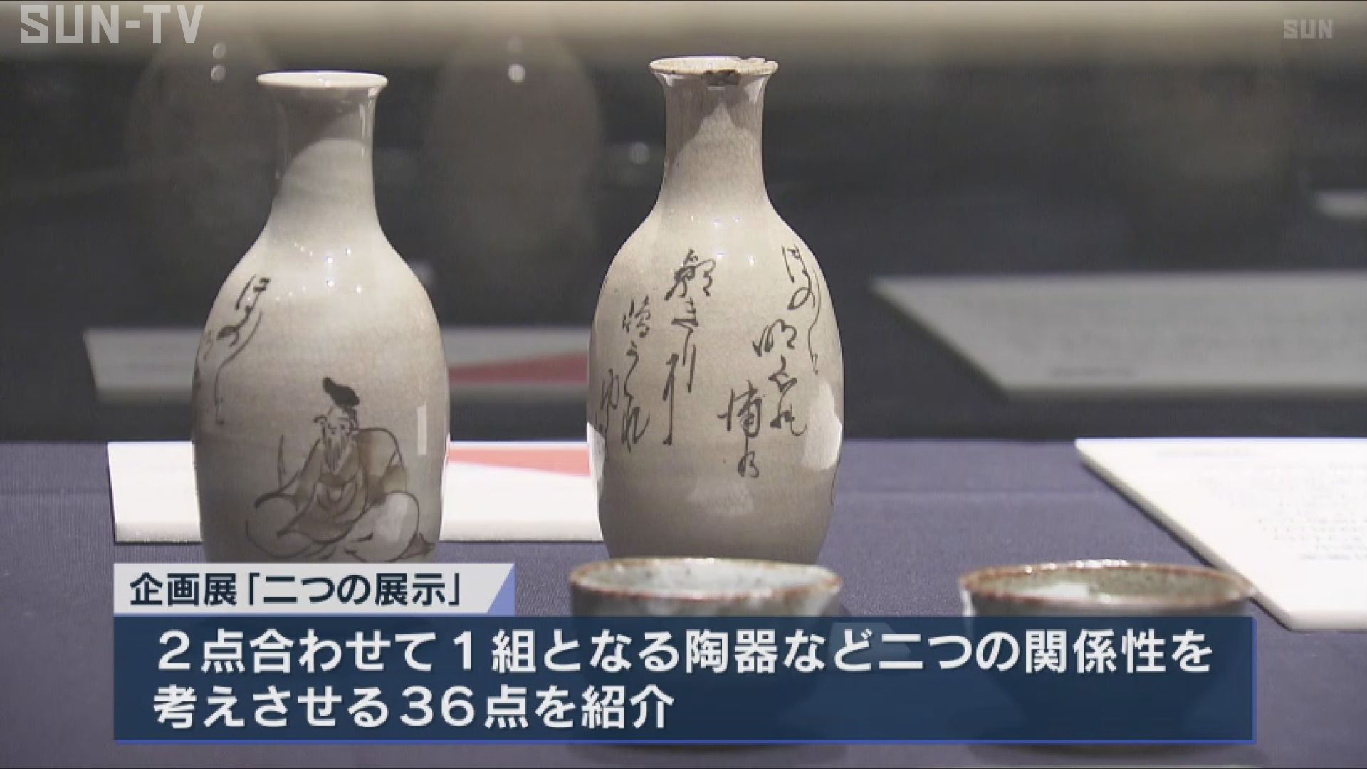この展覧会は、収蔵品の中から明石ゆかりの作家の作品を中心に、二つのモチーフが描かれた日本画や、2点合わせて1組となる陶器など、二つの関係性を考えさせる36点を紹介しています。
