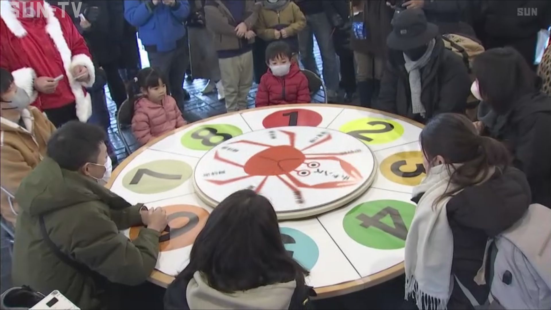 雪が積もるJR城崎温泉駅前の広場では、160人の参加者たちが8人1組になり特大ルーレットを回します。