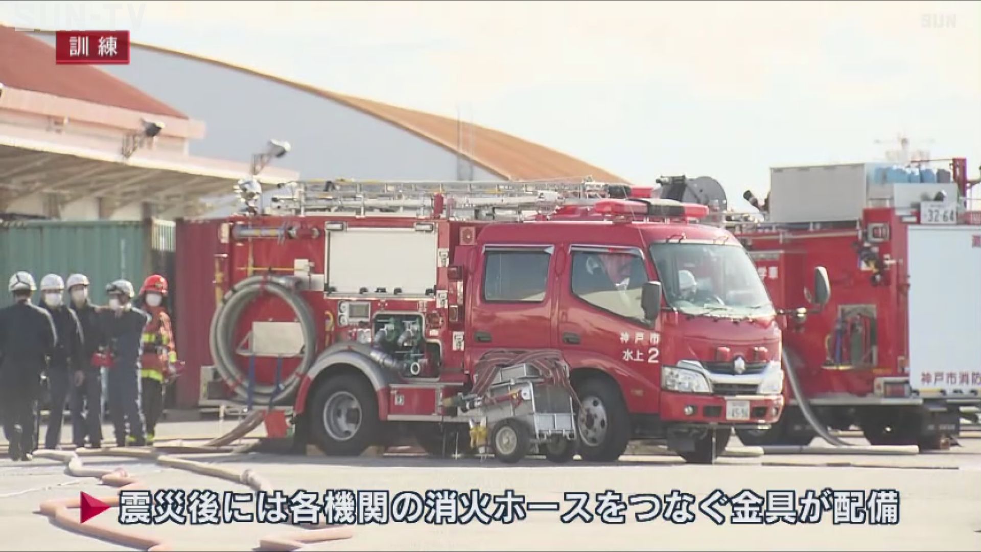 訓練は、神戸市内で直下型地震が起き、内陸部で火災が発生した想定で行われ、神戸海上保安部と神戸市消防局、それに兵庫県警が参加しました。 1995年1月17日の阪神淡路大震災では、各地で同時に火災が発生し、全国から巡視艇や消防車が集まって消火にあたりましたが、それぞれの消火ホースの形状が異なり、円滑な消火活動が行えない事態になりました。