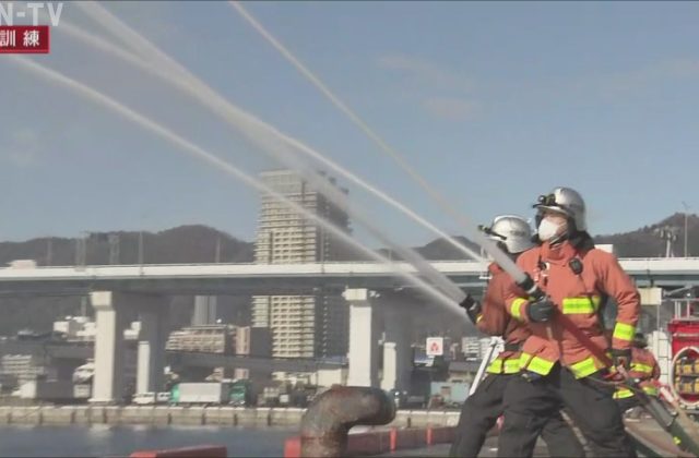 訓練は、神戸市内で直下型地震が起き、内陸部で火災が発生した想定で行われ、神戸海上保安部と神戸市消防局、それに兵庫県警が参加しました。 1995年1月17日の阪神淡路大震災では、各地で同時に火災が発生し、全国から巡視艇や消防車が集まって消火にあたりましたが、それぞれの消火ホースの形状が異なり、円滑な消火活動が行えない事態になりました。