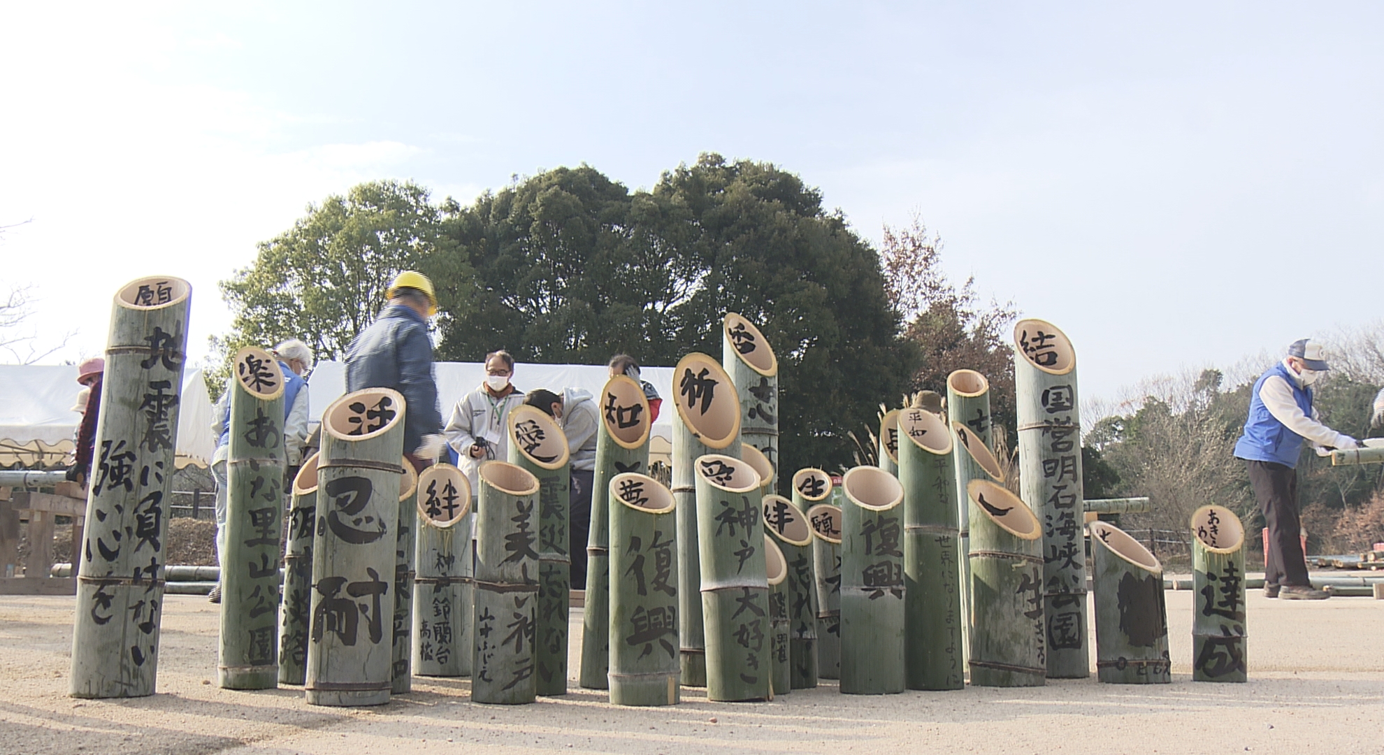 黙とうを捧げた後、園内の竹やぶから竹およそ50本を切り出し、斜めに切りそろえた上で、思い思いの言葉を書き入れました。