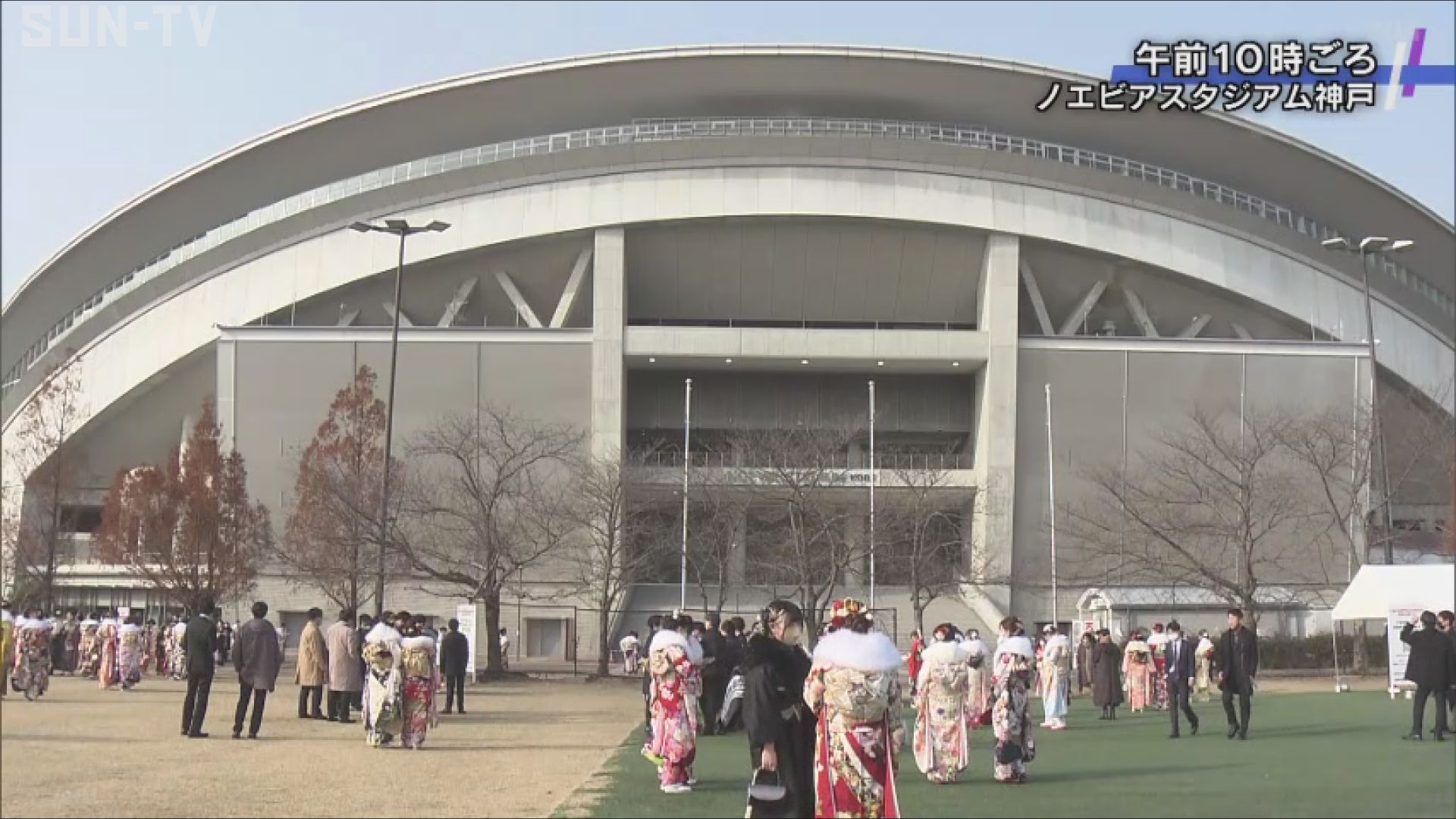 神戸市兵庫区のノエビアスタジアム神戸には華やかな振り袖やスーツに身を包んだ若者たちが集まりました。 神戸市は去年まで成人の日に「成人お祝いの会」を開催していましたが、成人年齢が18歳に引下げられたことを受け、ことしから「神戸市はたちを祝う会」に名称を変更し、従来通り二十歳を迎える人を対象に開催しました。