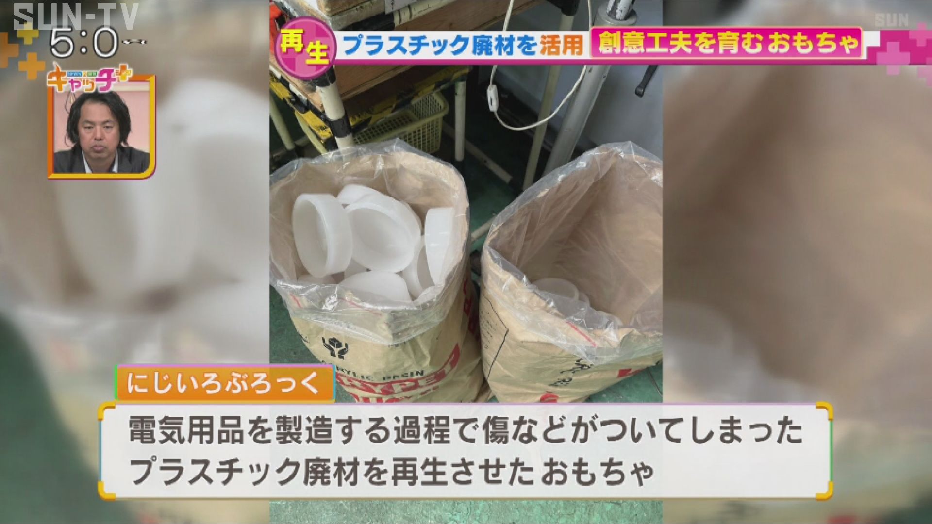 「にじいろぶろっく」は、電気用品を製造する過程で傷などがついてしまったプラスチック廃材を再生させたおもちゃです。