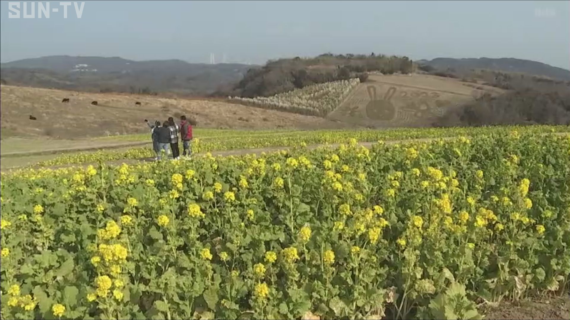 地元の園児の作品をもとに牧草を刈り込んで作った「うさぎ年」がテーマの巨大なアースワークを背景に、黄色い菜の花が咲き誇っています。