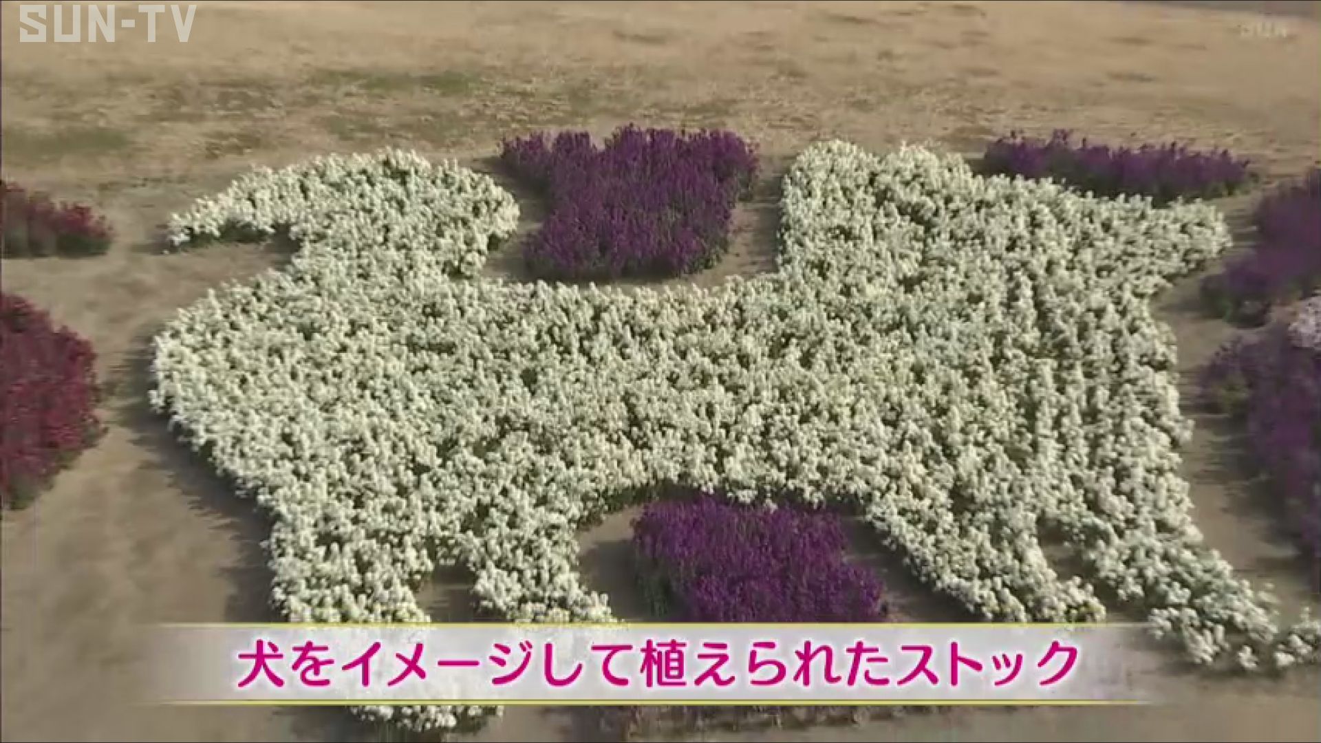 また、園内では、犬をイメージして植えられたアブラナ科のストックも見頃になっていて、展望デッキからかわいらしい犬のデザインを楽しむことができます。