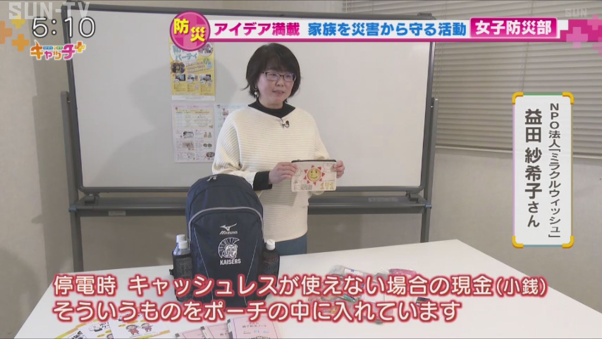その後、防災についての様々なイベントやPR活動を行っている益田さん。災害に備えてカテゴリー別に分けた持ち出し用のリュックを準備することも大切だといいますが、さらにもうひとつ…