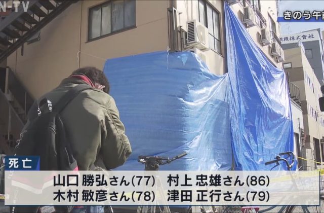 警察と消防は午前9時ごろから現場検証を行い、火災の起きた集合住宅の1階と2階部分を中心に詳しく調べています。 きのう未明、神戸市兵庫区の3階建て集合住宅で起きた火災では、いずれも1階に住む山口勝弘さん(77)と村上忠雄さん(86)、木村敏彦さん(78)、津田正行さん(79)の4人が死亡し、2人が意識不明の重体、2人が重傷を負いました。