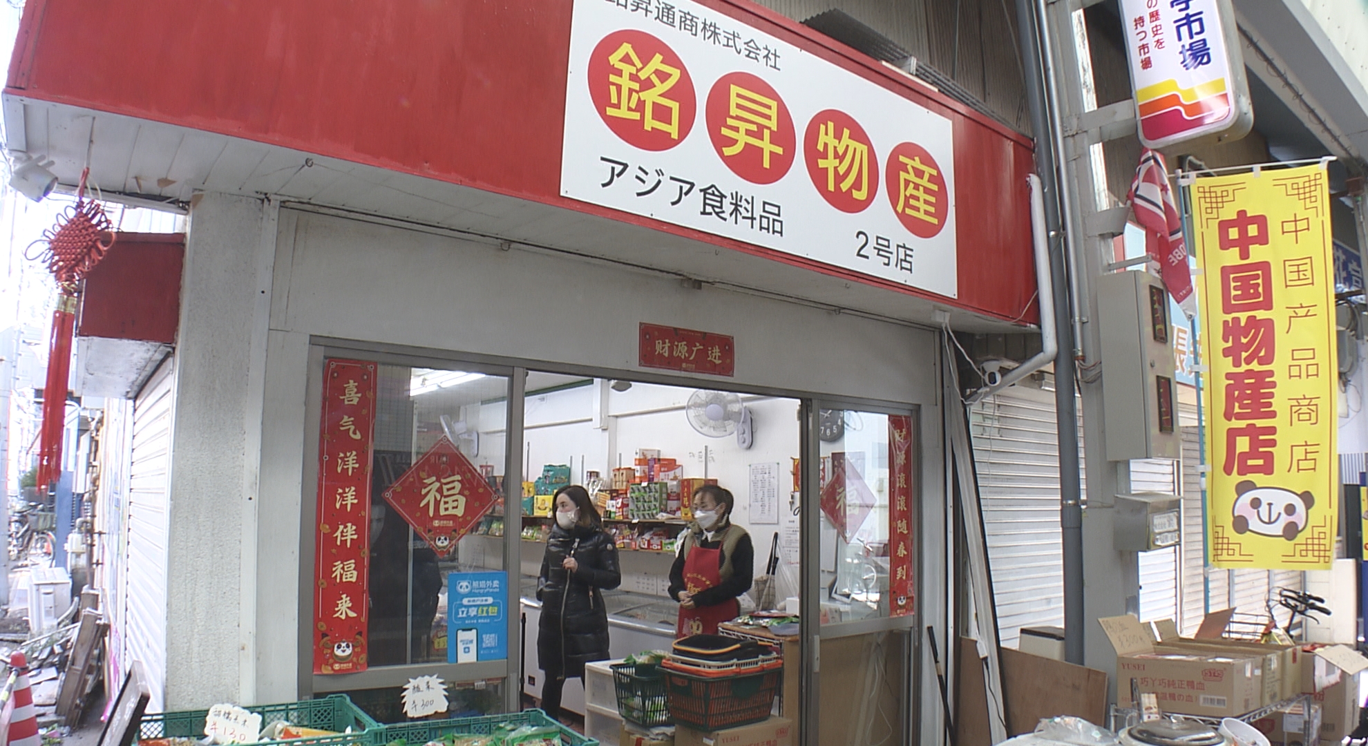 「中国物産店」ののぼりが目立つ「銘昇物産」は、本場中国の食品を中心に販売する専門店。