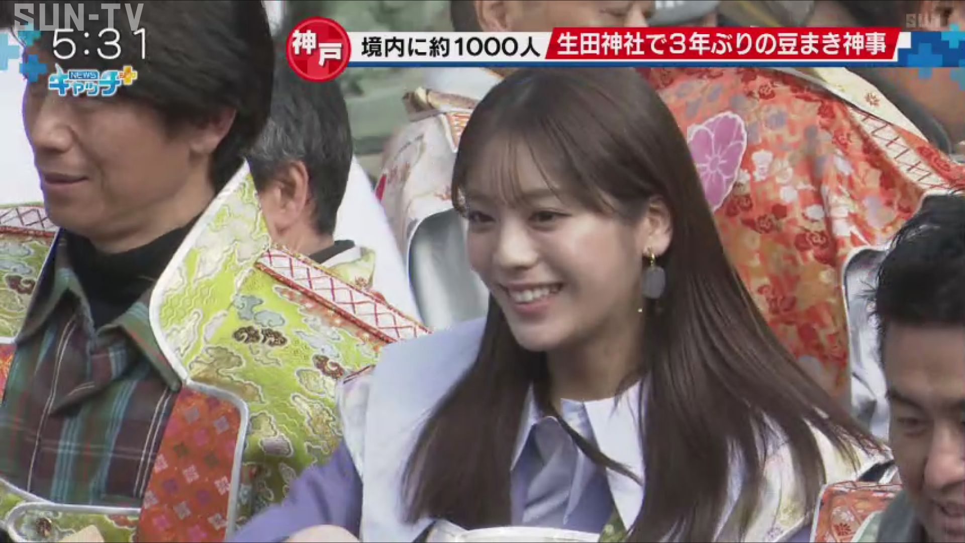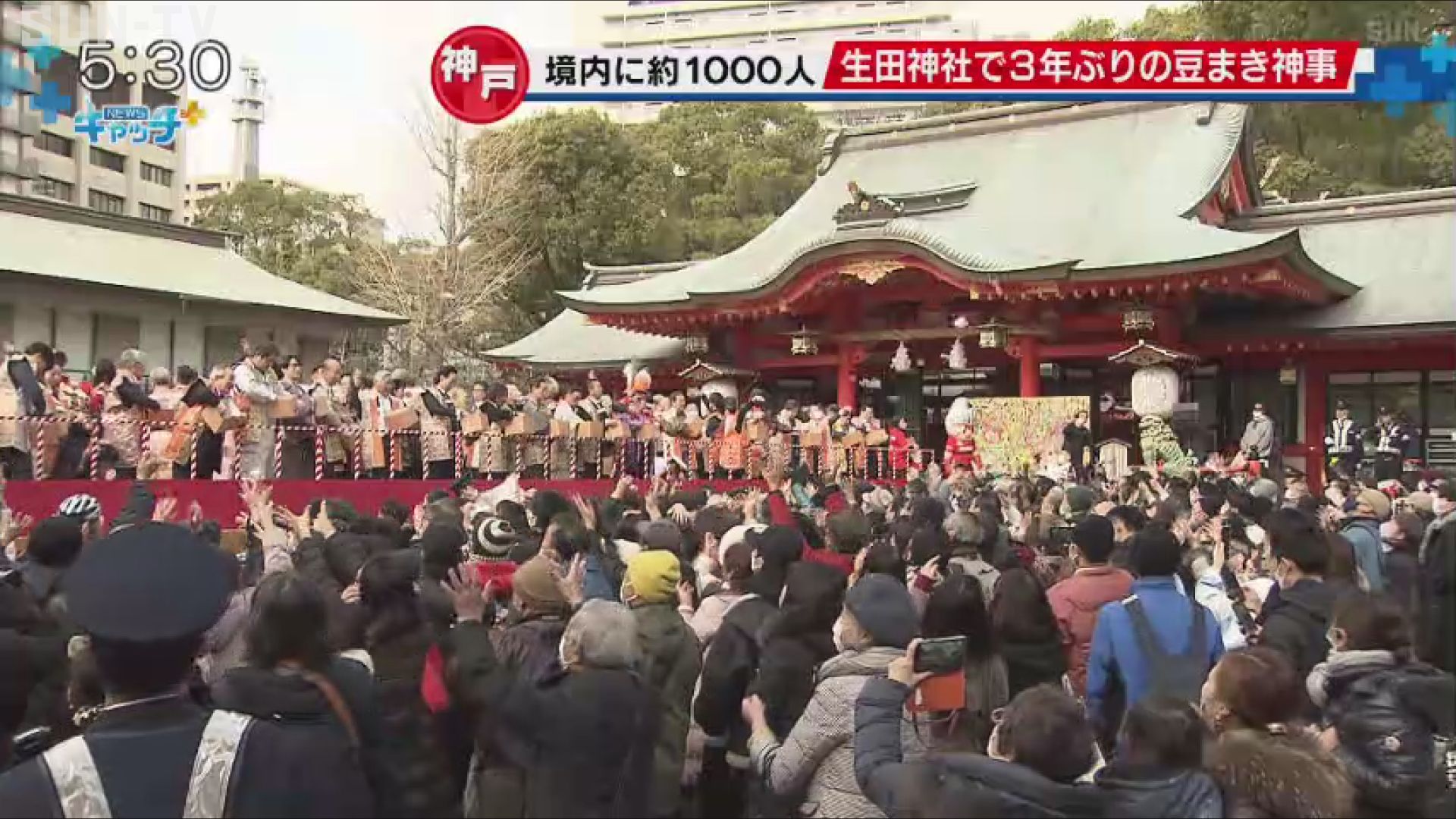 境内を埋めつくすおよそ1000人の人たち。神戸市中央区の生田神社では、新型コロナの影響でおととしから「福豆」を参拝者に手渡す方法に変更していましたが、ことしは3年ぶりに豆まき神事が復活しました。