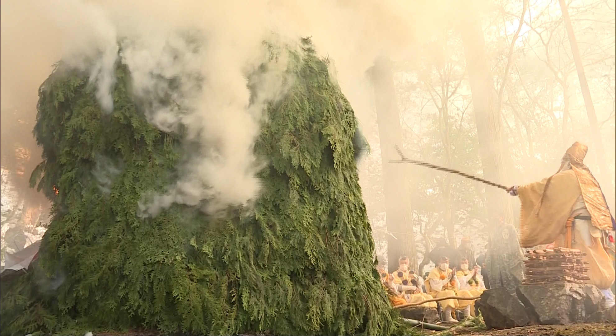 境内には、丸太とヒノキの葉でくみ上げた高さ5メートル、直径3メートルの護摩壇が準備され、僧侶と山伏が儀式を行いながら、火を点けました。 すると、巨大な白い煙と炎が上がり、訪れた人は、1年の無事などを願っていました。