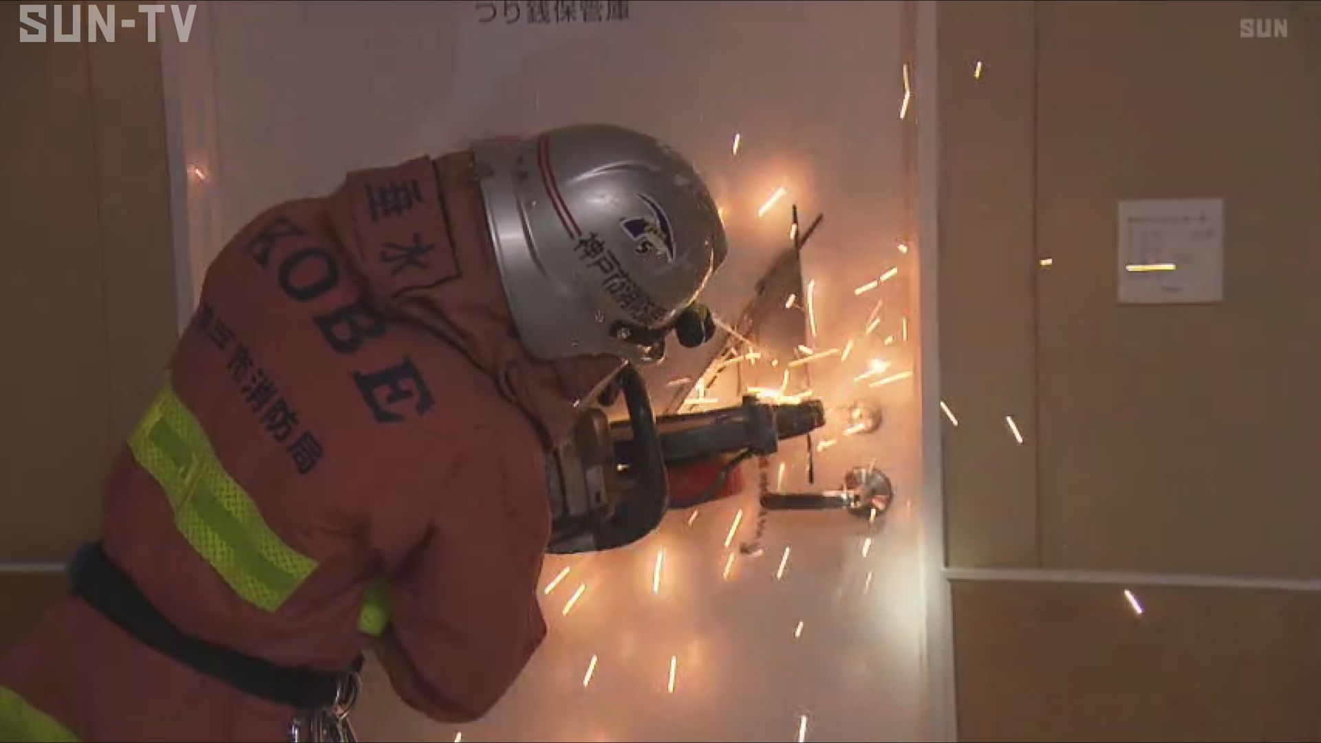 中央にある建物では、火災現場で部屋に人が閉じ込められているという想定で、鉄の扉をエンジンカッターや斧などでこじあける訓練が行われました。