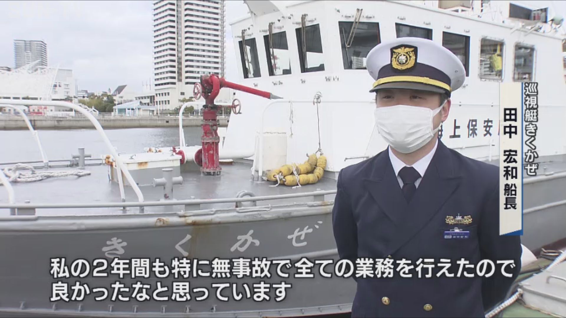 「きくかぜに乗らせてもらって2年たつんですけど、先代の船長たちが無事故で海難救助等々完遂できたことを、私の2年間も特に無事故で全ての業務を行えたので良かったなと思っています。」