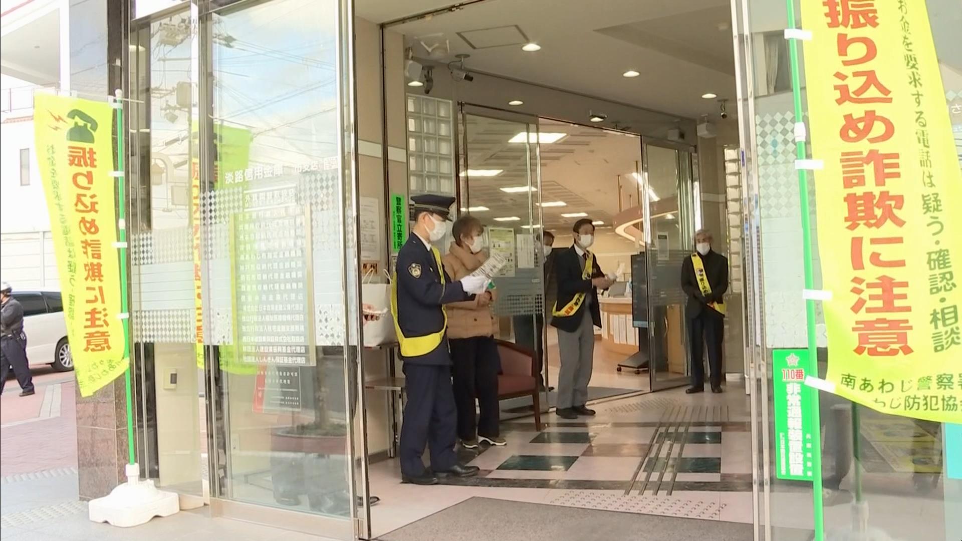 南あわじ市では、地元の防犯協会が中心となって2年ほど前から、年金支給日にあたる偶数月の15日に振り込め詐欺への注意を呼び掛ける活動を行ってます。
