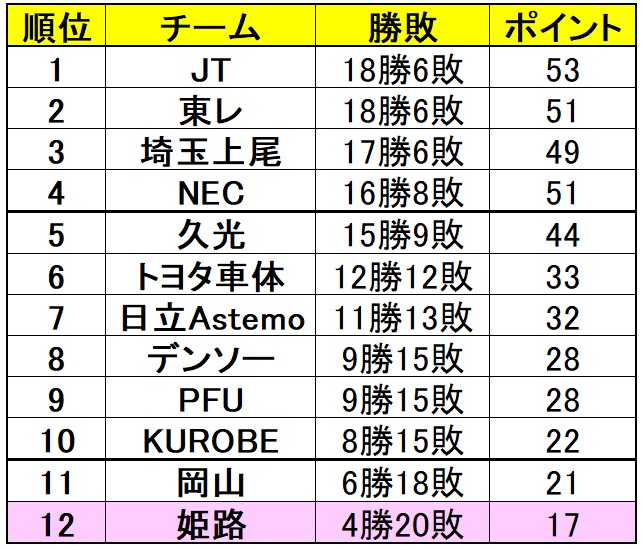 入れ替え戦出場を免れたい姫路だが、24試合を消化して、10位KUROBEとはなお勝利数「4」差がある。