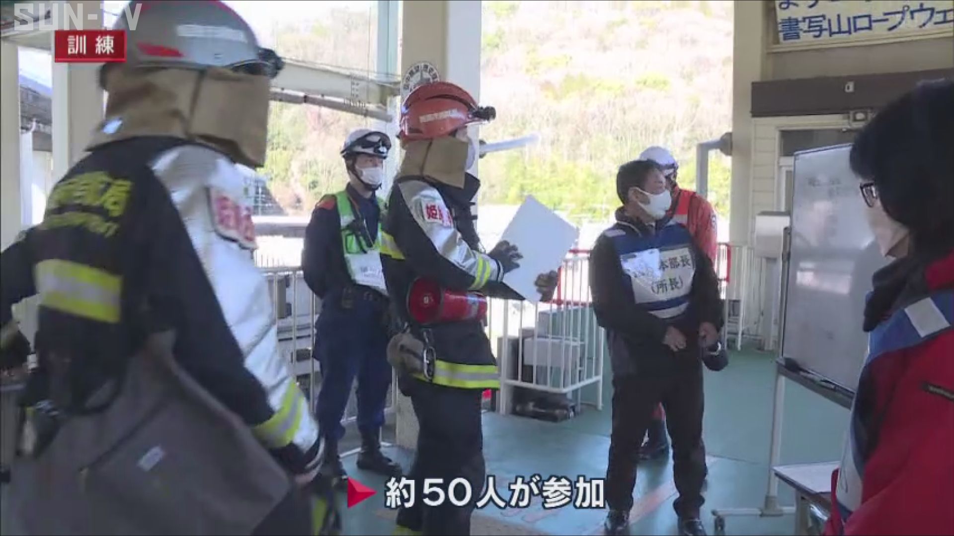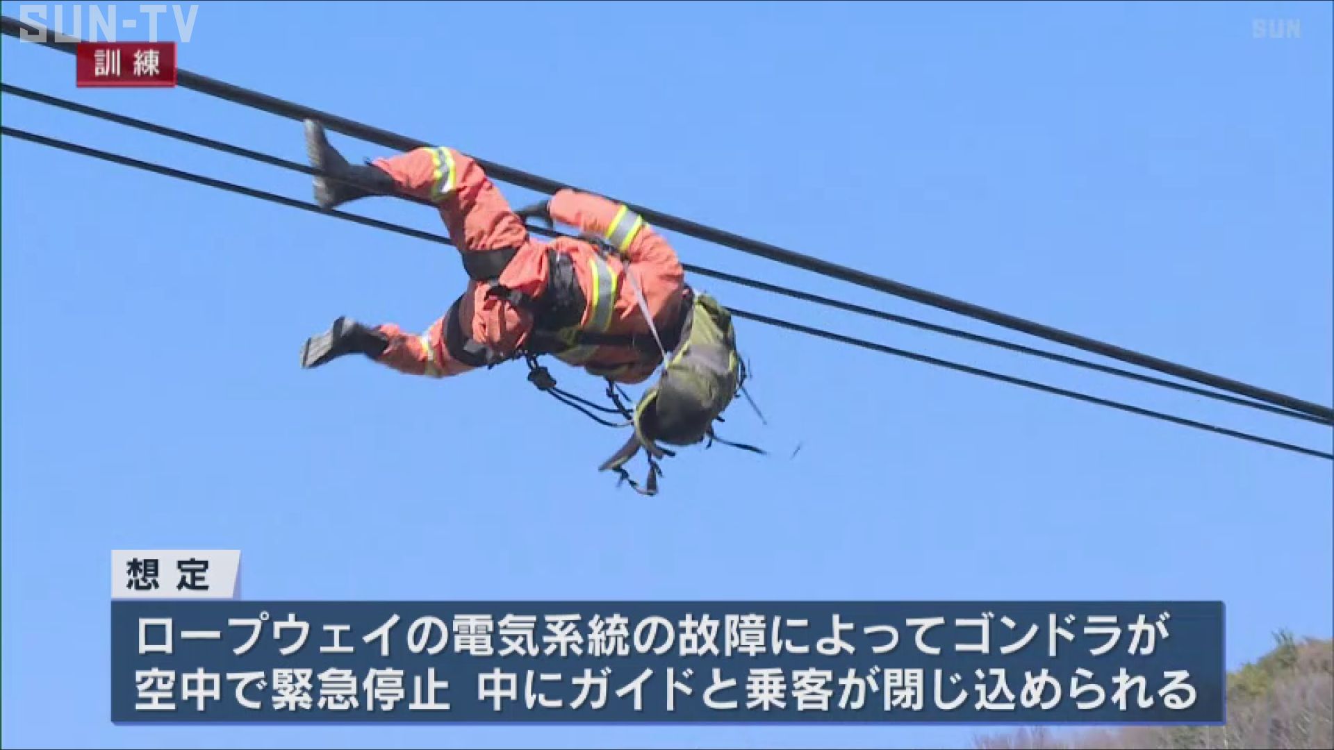 訓練はロープウェイの電気系統の故障によってゴンドラが空中で緊急停止し、中にガイドと乗客が閉じ込められたという想定で行われました。