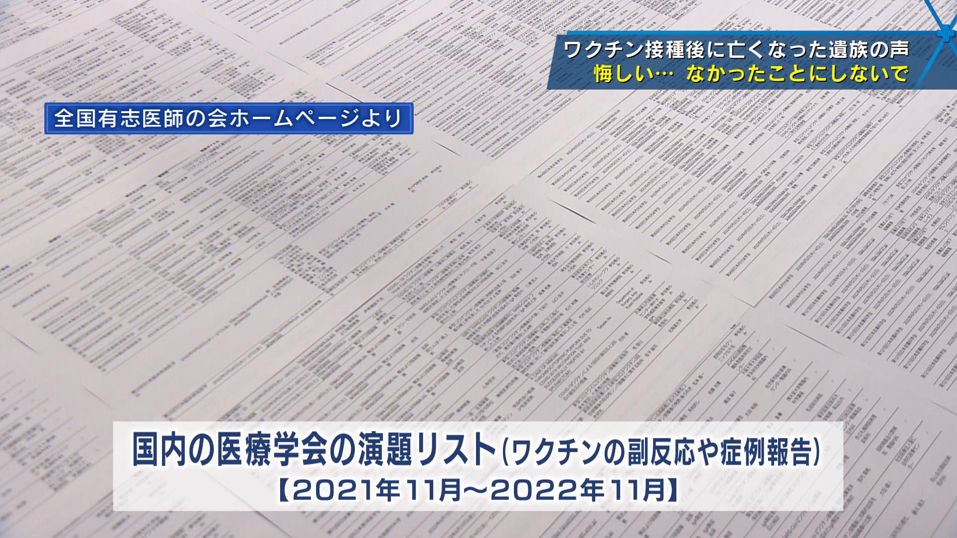 国内の医療学会で新型コロナワクチン接種後の死亡症例の報告や副反応に関連する発表があったリストです。その内容は、心筋炎や帯状疱疹にとどまらず、さまざまな症例報告が全国の病院や大学の医師たちから報告されています。学会で発表があった数はこの1年間で300件を超えました。