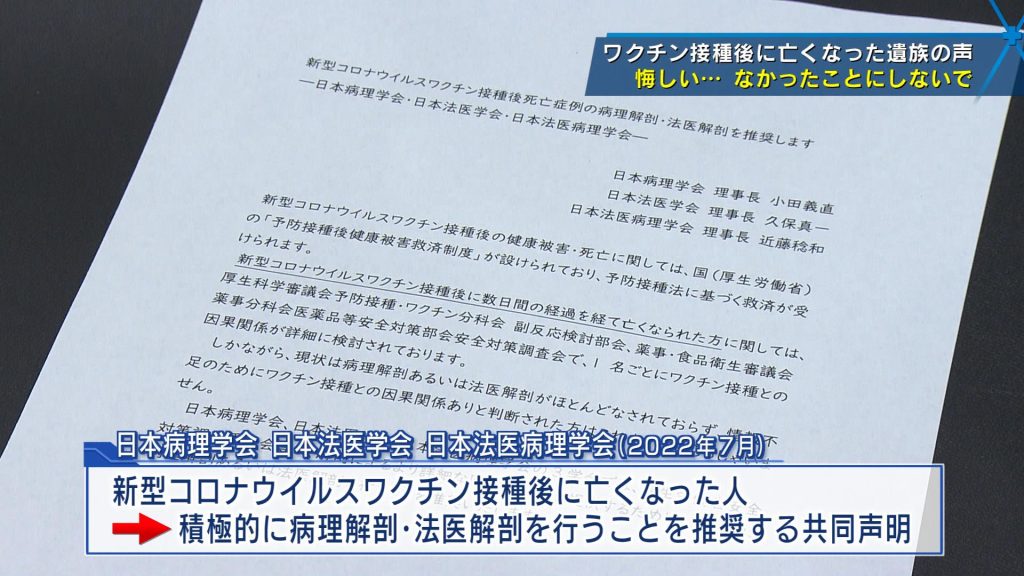 この5カ月後の2022年7月、日本病理学会と日本法医学会、日本法医病理学会は積極的な病理解剖、法医解剖を推奨するよう共同声明を発表していました。大学病院の医師からワクチンの副反応の疑いとしてPMDAに報告がなかったことから、兄はかかりつけ医などから報告してもらいました。