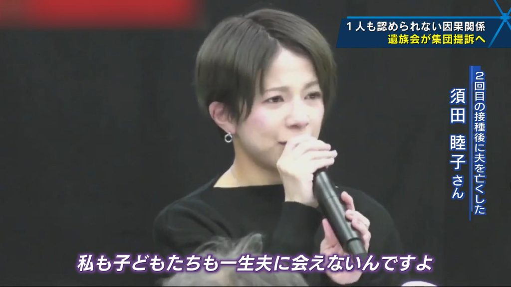 これまでに257人の遺族から相談がありましたが、相談者の8割が、亡くなっても副反応疑い報告制度で報告されなかったそうです。国内では、病理医が解剖し因果関係ありと報告した人ですら因果関係不明と覆され、1人も因果関係が認められた事例はありません。因果関係の認定を求めて、繋ぐ会では、現在、54人の遺族が集団訴訟の準備を進めています。36歳の夫を亡くした女性は、記者会見で窮状を訴えかけました。