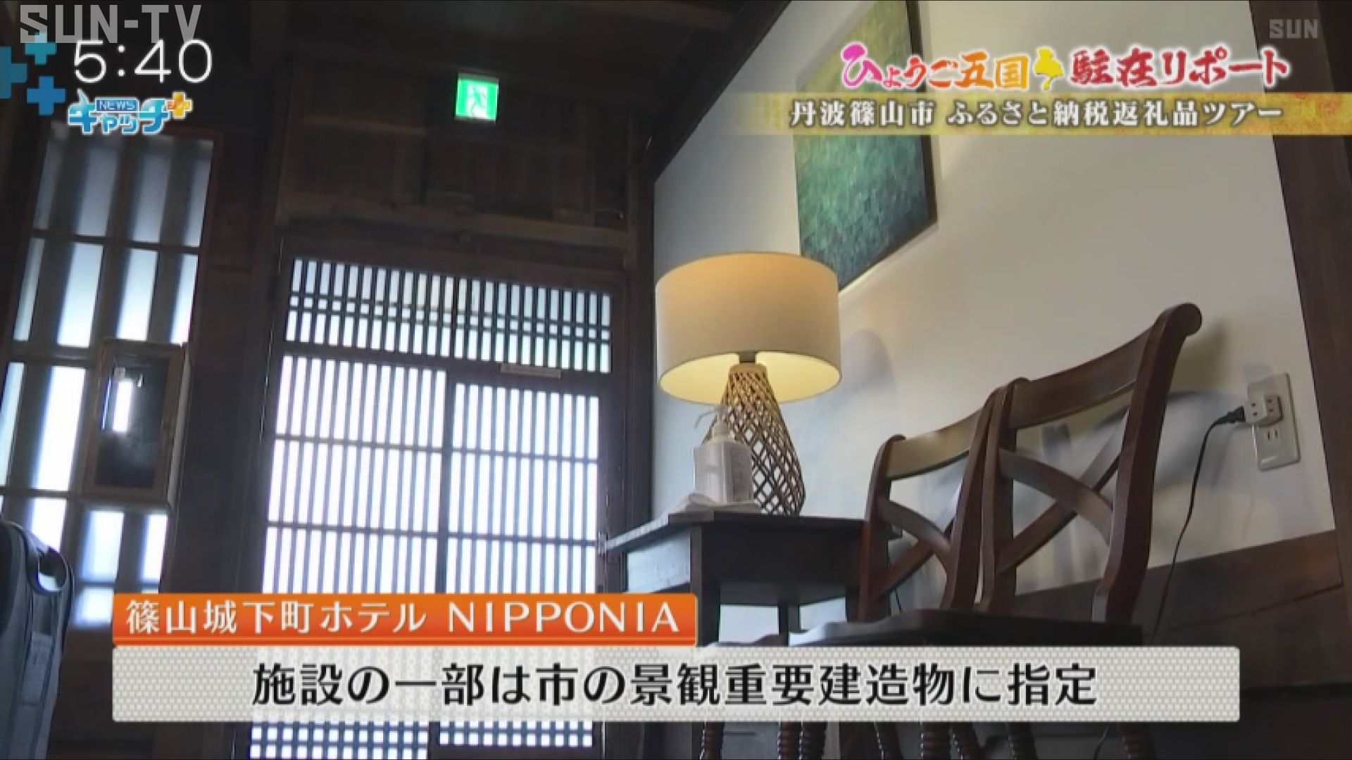 このプランで宿泊できる施設がこちら。ここは明治時代の古民家を改装した、「篠山城下町ホテル NIPPONIA」です。施設の一部は市の景観重要建造物に指定されています。