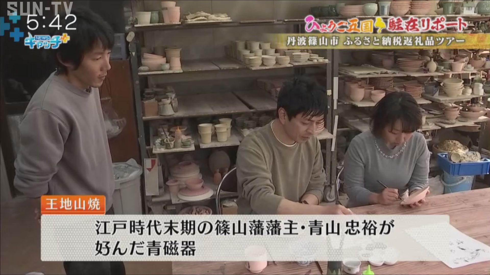 体験プランも充実しています。2人が挑戦しているのは篠山藩主・青山忠裕が好んだ青磁器「王地山焼」の絵付け。明治時代に一度途絶え、昭和に入って復活した丹波篠山市の伝統工芸が楽しめます。