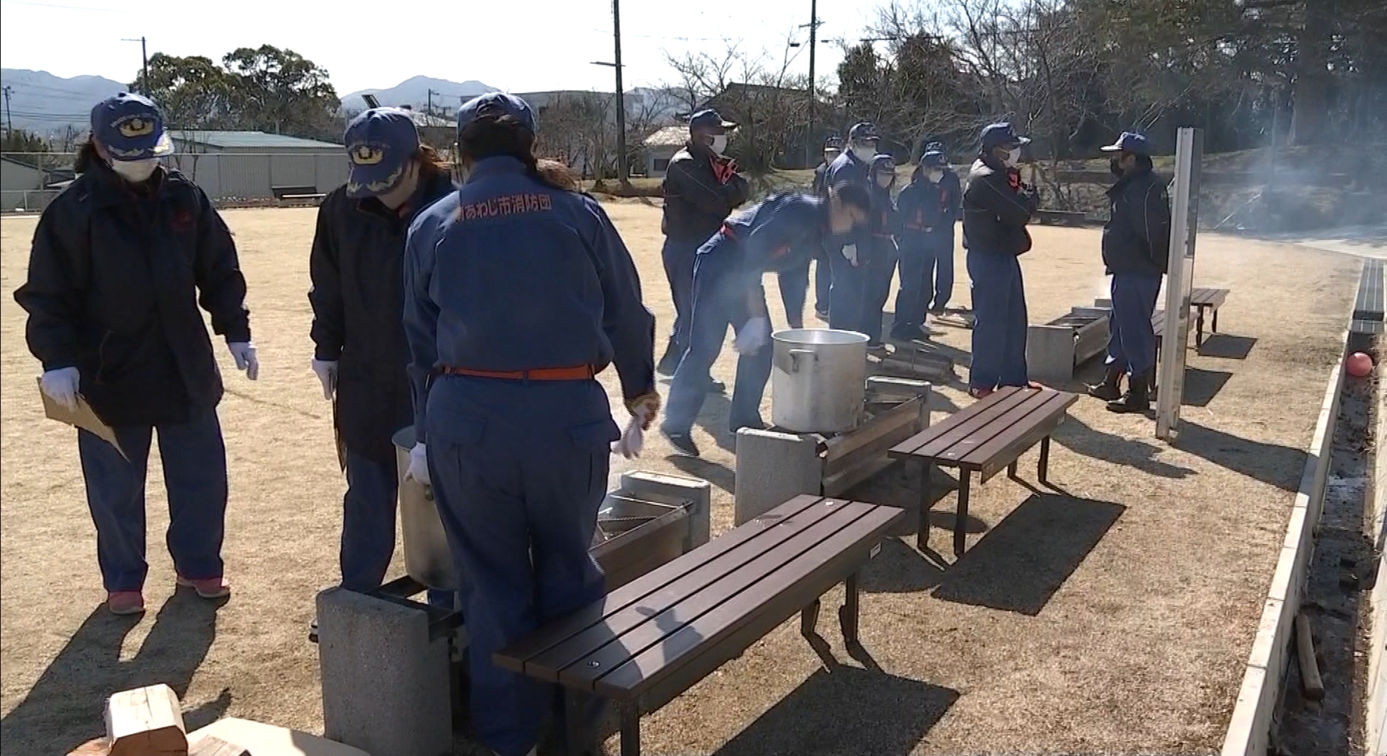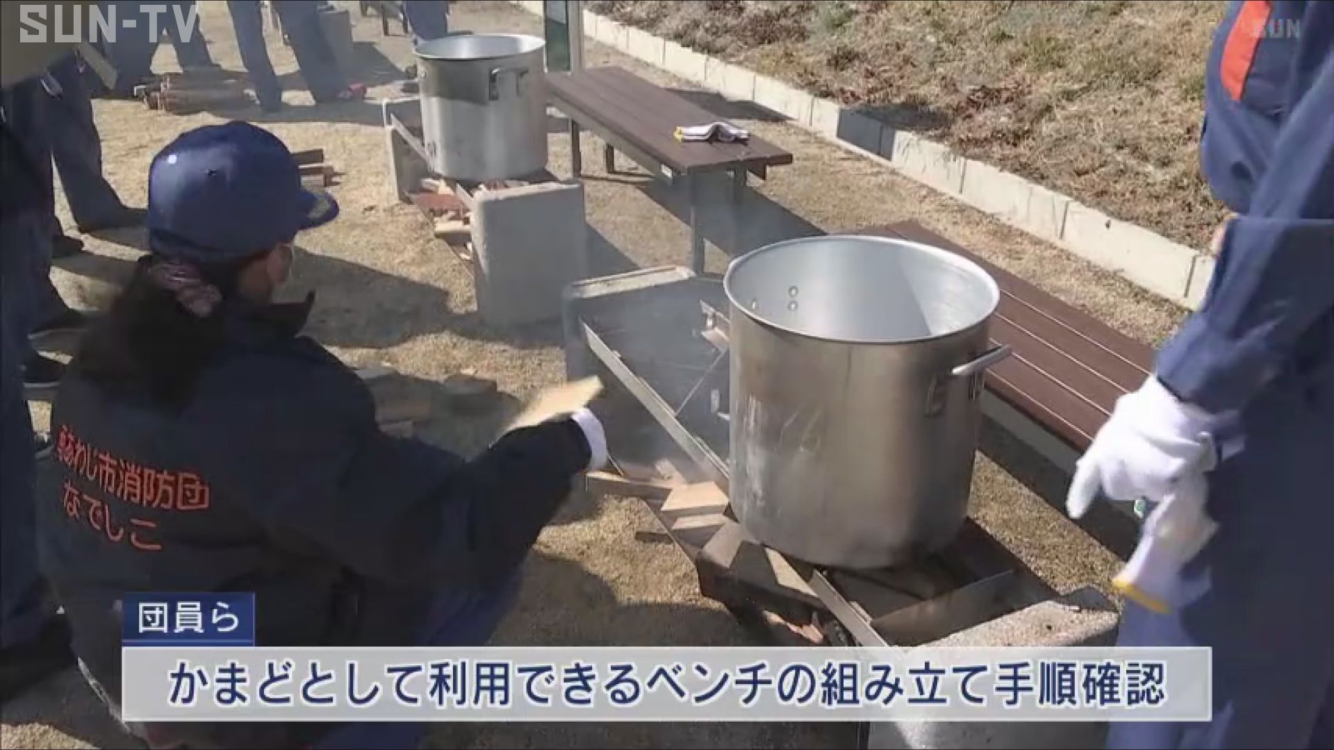 兵庫県南あわじ市では、災害ベンチを活用し、女性消防団員が炊き出しの訓練を行いました。