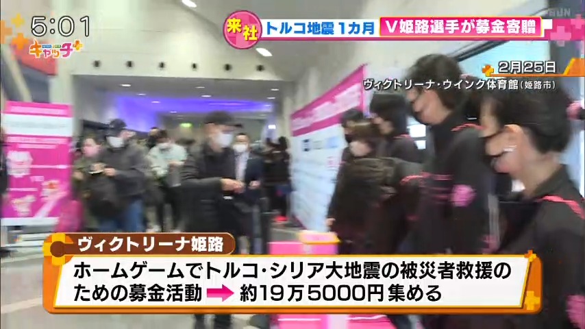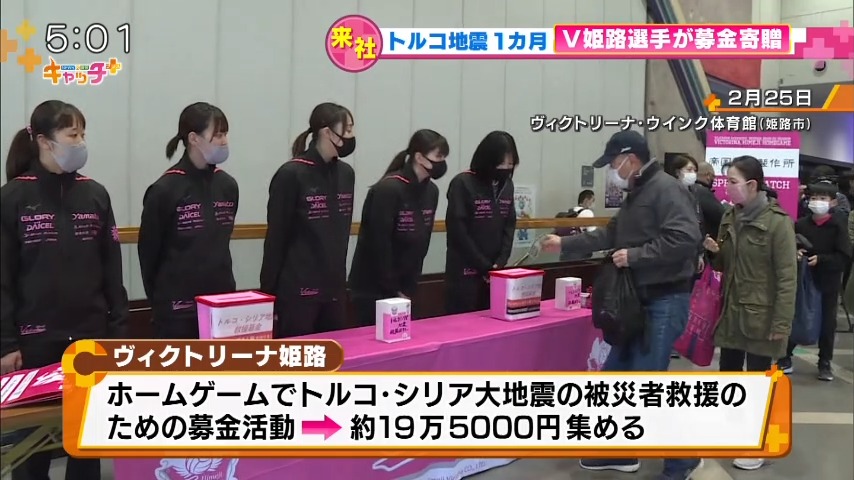 ヴィクトリーナ姫路は2月、リーグ戦ホームゲームでトルコ・シリア大地震の被災者救援のための募金活動を行い、ファンらからおよそ19万5000円を集めました。
