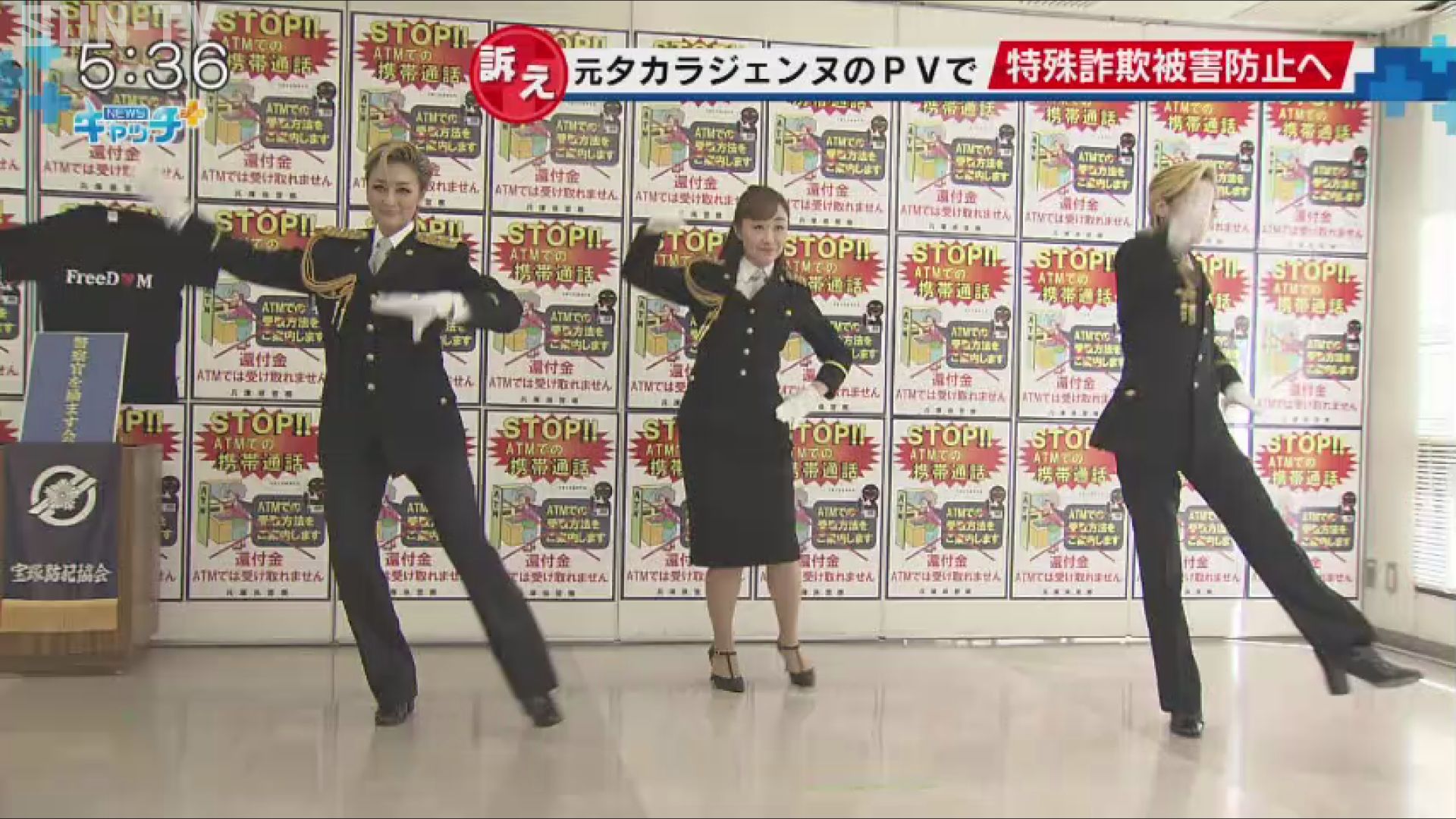 今回、動画を刷新するにあたり、元タカラジェンヌが起用され、3人は署員らと同じ振り付けのダンスを披露し、サンバのリズムに合わせて詐欺被害の防止と交通安全を呼び掛けました。