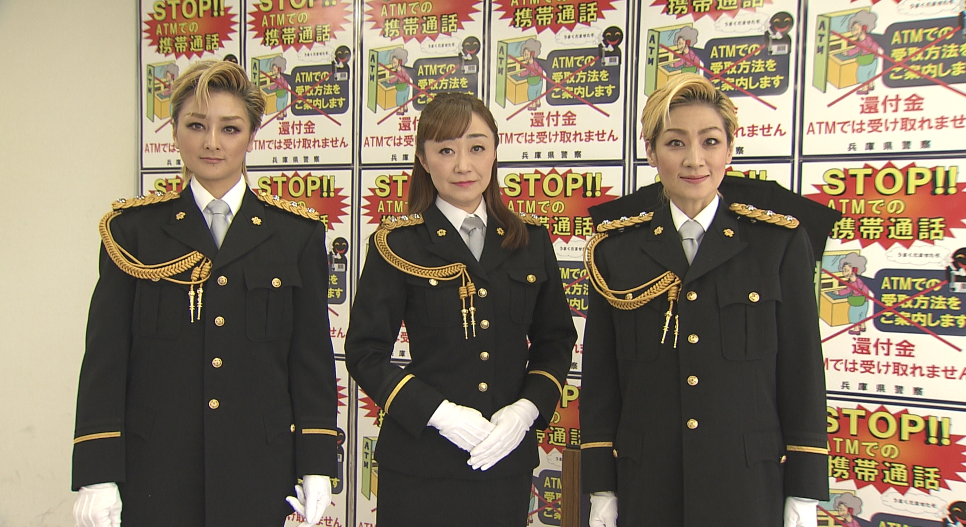 警察官の制服を身にまとい、特殊詐欺被害の防止を呼び掛けるのは、元タカラジェンヌの毬穂(まりほ)えりなさんと鳴海(なるみ)じゅんさん、それに、綺華(あやか)れいさんの3人です。