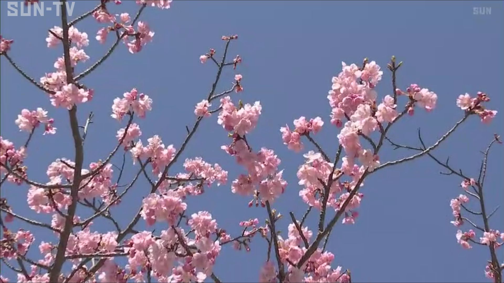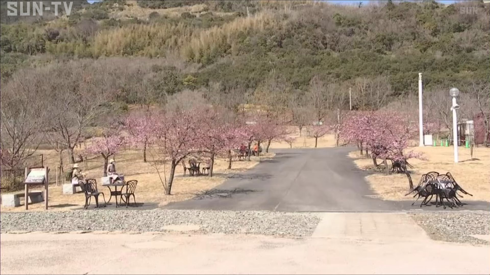 淡路市の国営明石海峡公園では、早咲きのカワヅザクラが見頃を迎えています。