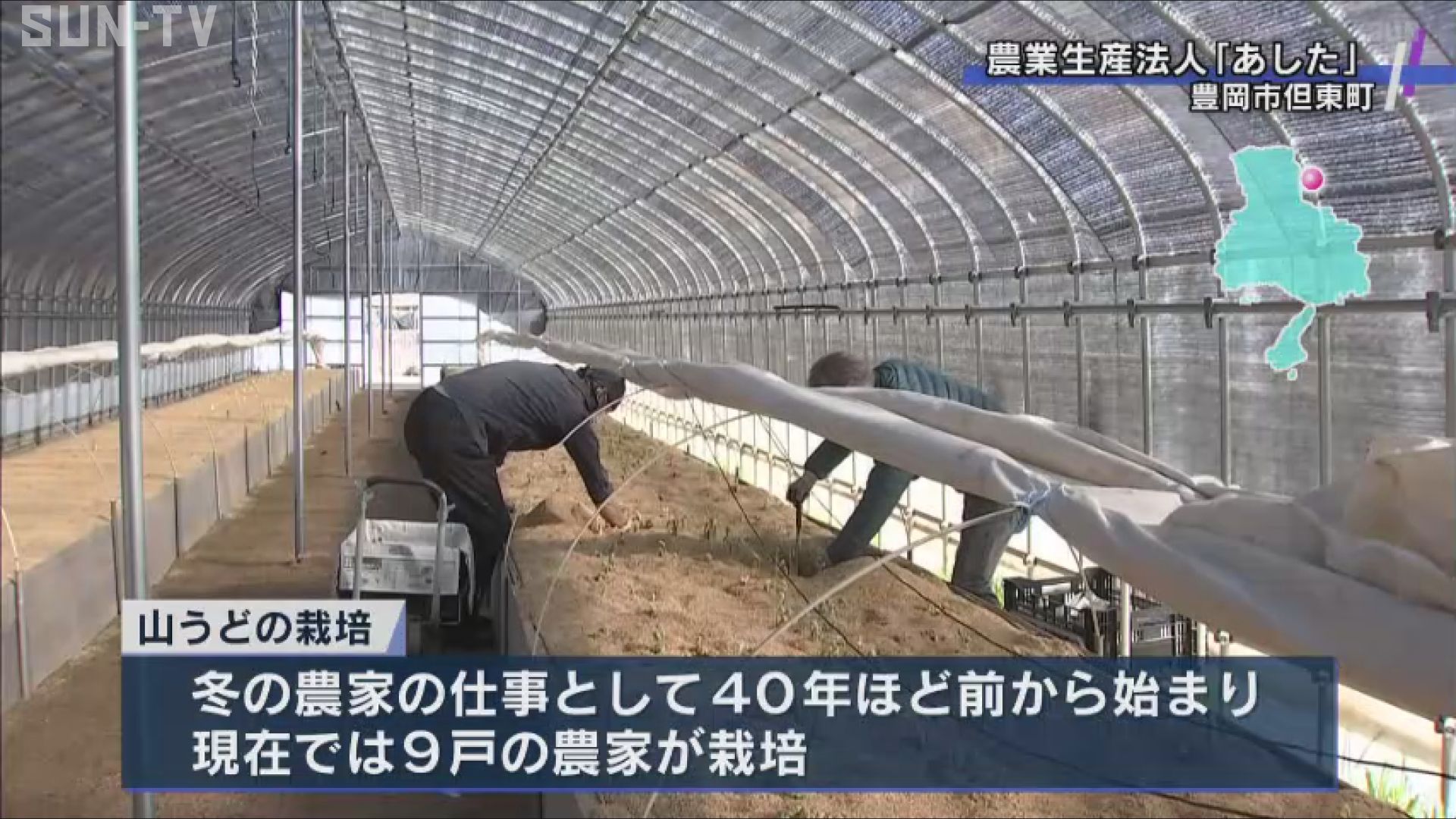 豊岡市但東町では、冬の農家の仕事として、40年ほど前から「山うど」の栽培が始まり、現在では9戸の農家が、栽培しています。 出荷が始まったこちらの生産農家では、ビニールハウス内のもみ殻を敷き詰めた苗床から、長さ40センチほどに育った山うどを、丁寧に掘り出して、箱詰めしていきます。