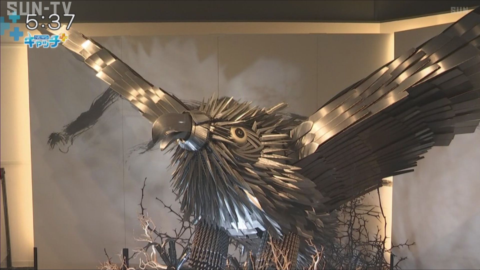 のこぎりや包丁など、およそ6000点の金物を1本ずつ組み立てて作られる金物鷲は、「金物のまち」三木市の象徴として地域を盛り上げようと1952年のイベントで初めて披露され、以来、改良が加えられ今回が5代目となります。