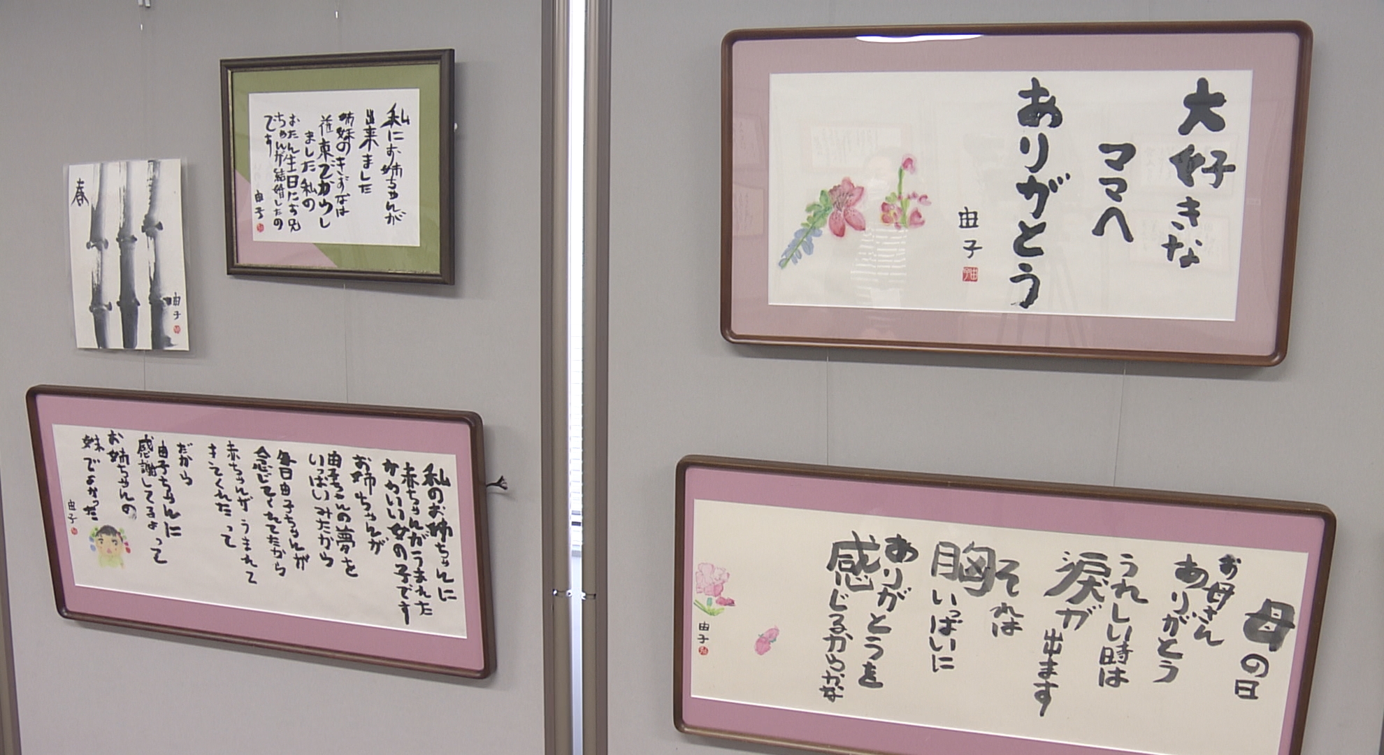 芦屋市の木口記念会館では、ダウン症の書道家隅野由子さんの作品を集めた展覧会が開かれています。