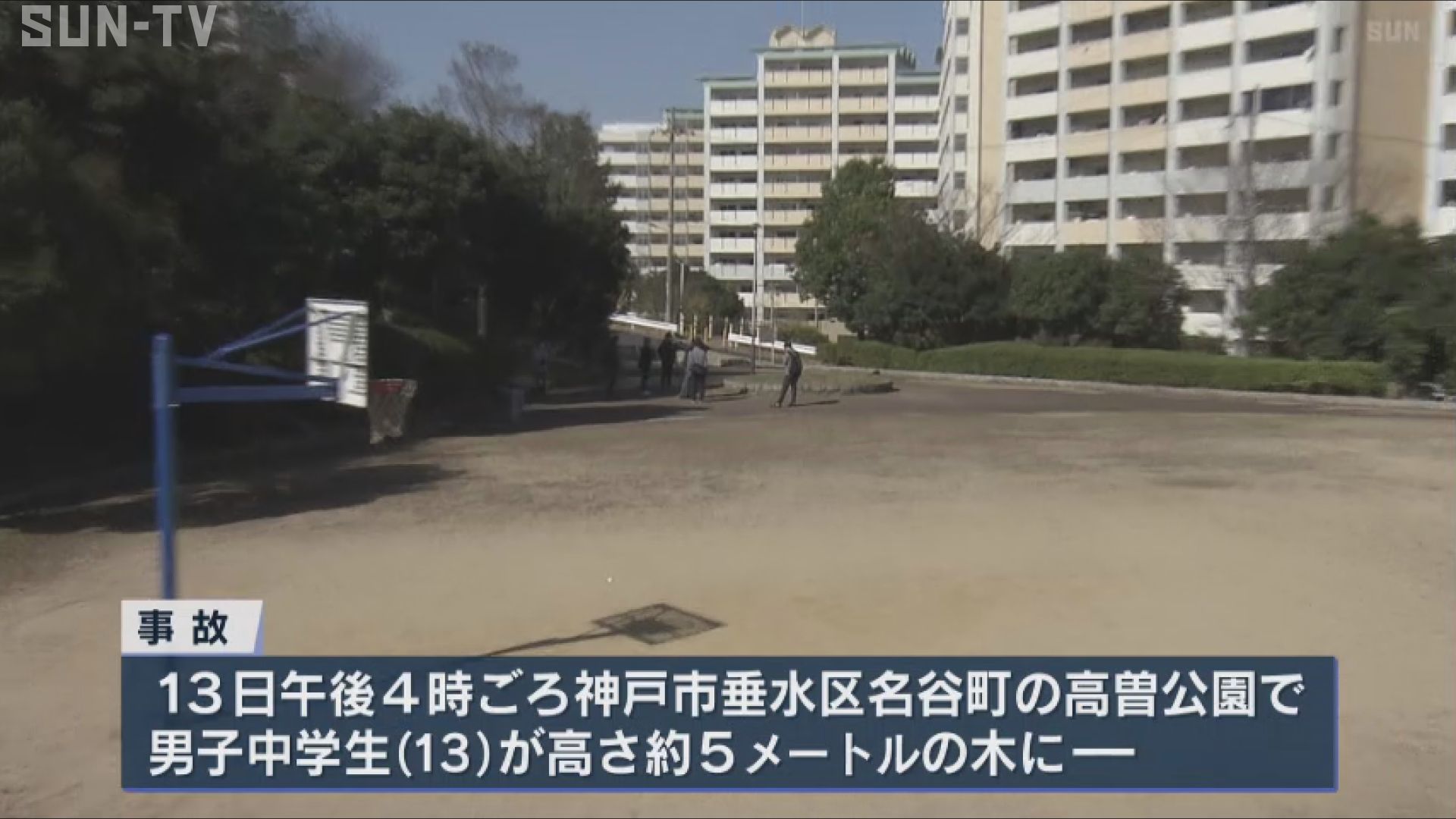 神戸市によりますと13日午後4時ごろ、神戸市垂水区名谷町の高曽公園で、ボール遊びをしていた男子中学生(13)が高さ約5メートルの木に引っかかったボールを取ろうとしていたところ、木が倒れ、下敷きになりました。