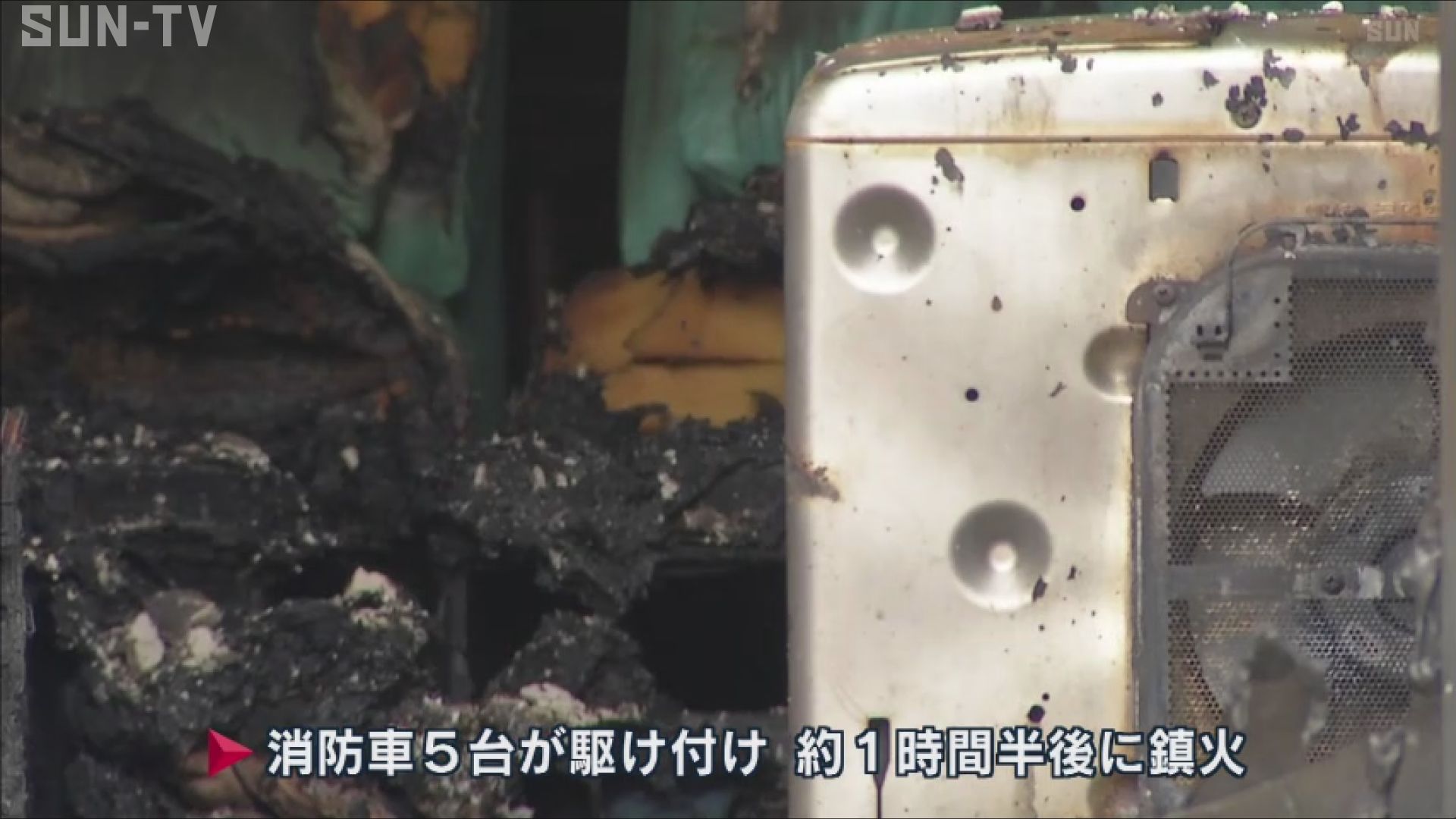 消防車5台が駆け付け、火はおよそ1時間半後に消し止められましたが、この火事で、木造2階建て住宅の1階にあるリビングが焼け、焼け跡から性別不明の1人の遺体が見つかりました。