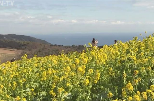 兵庫県洲本市で春の恒例となっている菜の花の迷路が完成し、3月26日、オープニングのイベントが開かれました。