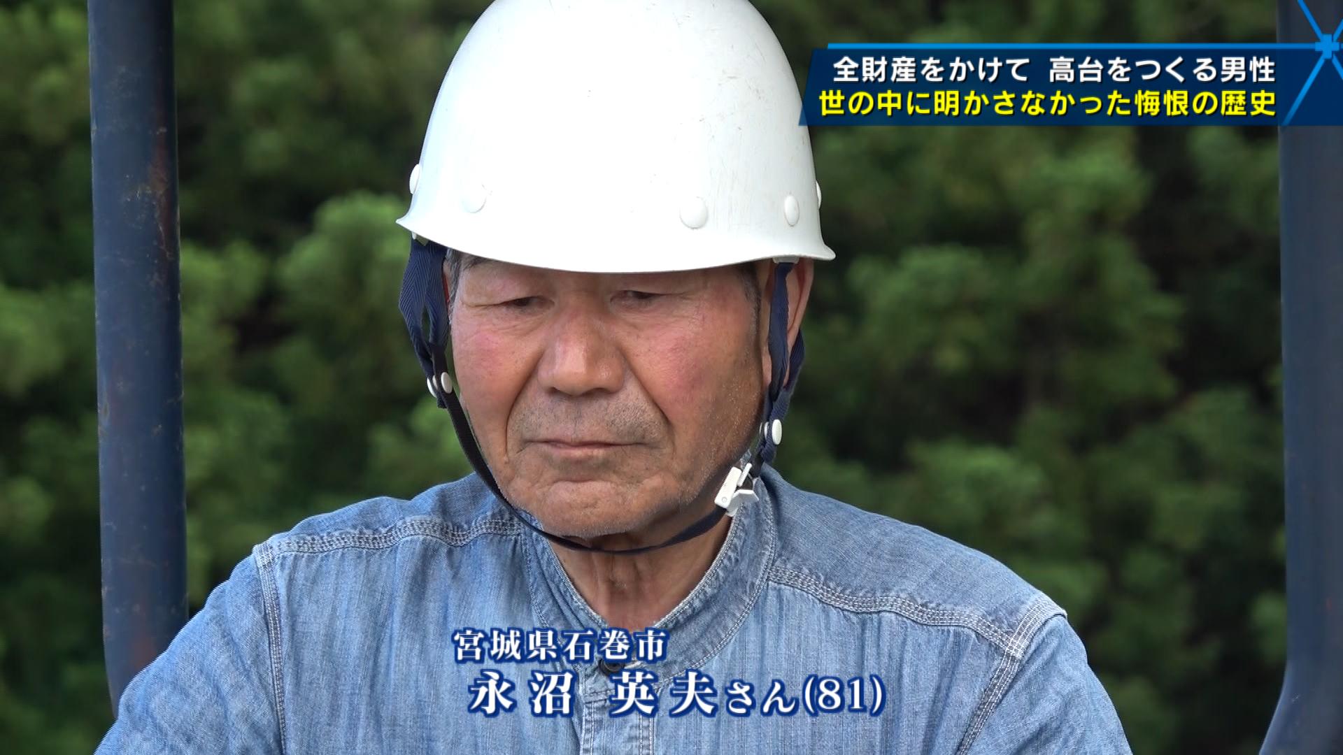 宮城県石巻市大川地区。東日本大震災の後、大部分が災害危険区域として居住が禁止されています。震災の1年前、北上川沿いの長面地区に自分で高台をつくり始めた住民がいます。永沼英夫さん(81)。復興事業の残土を業者から分けてもらって土を盛り、高台づくりに全財産をつぎ込みました。永沼さんは、津波で亡くなった人や裁判のことを配慮して、これまで世の中に明かさなかったことがあります。