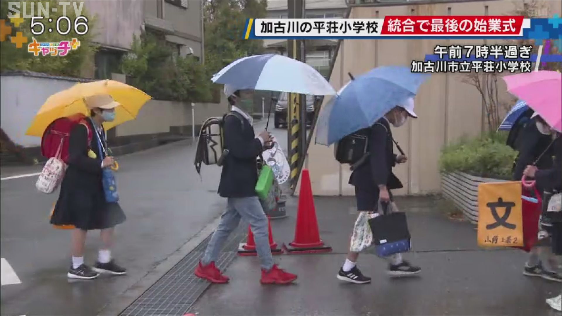 あいにくの雨の中でも元気に登校する子どもたち。加古川市の平荘小学校は、来年度に同じ地区の小中学校2校と統合され小中一貫の義務教育学校となるため、1学期の始業式は131年目の今回で最後となります。