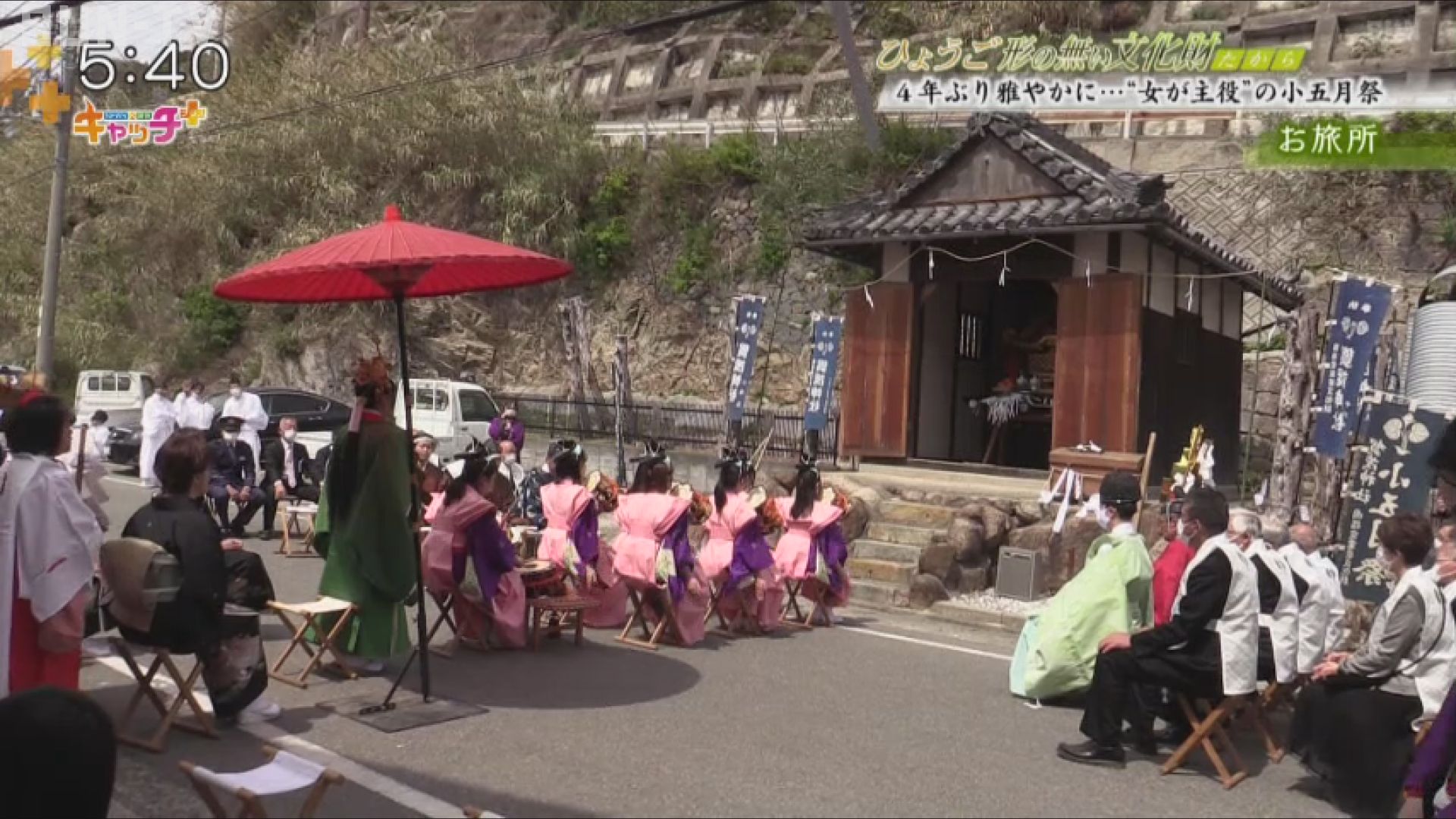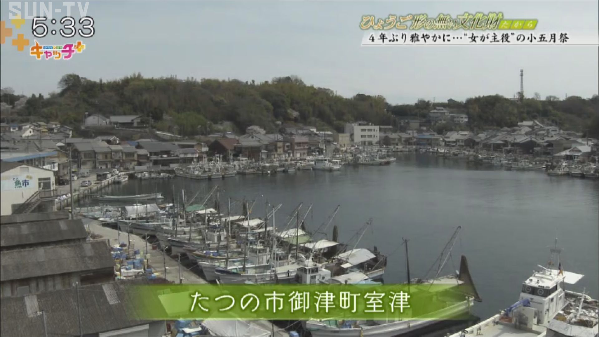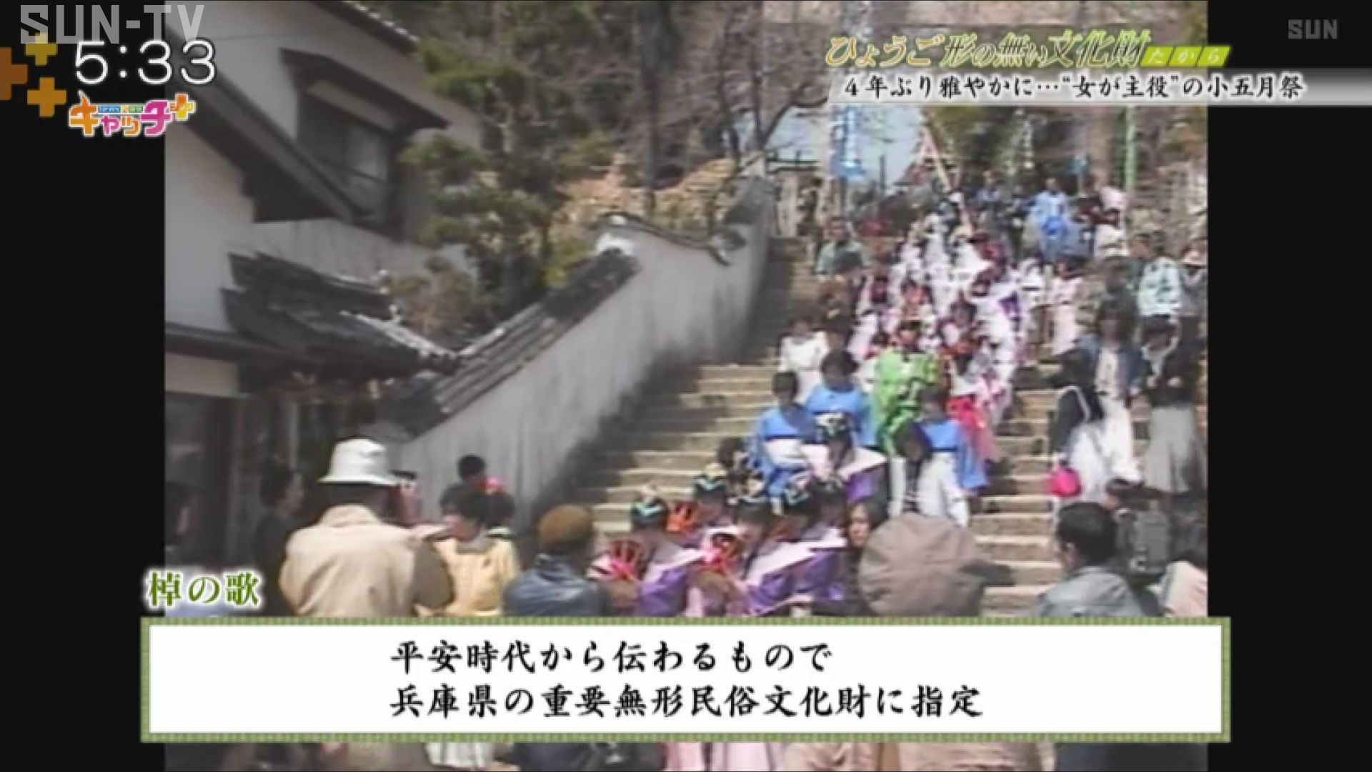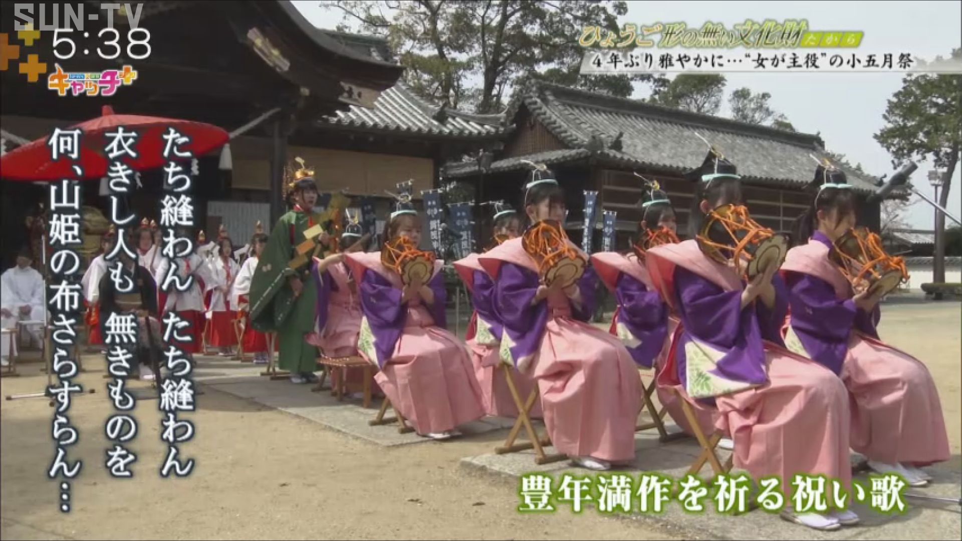 たつの市御津町の港町・室津の賀茂神社に伝わる「小五月祭」。毎年4月初めに行われる女の子の祭で、色鮮やかな衣装の女子高校生たちによって奉納されるのが、「棹の歌」です。
