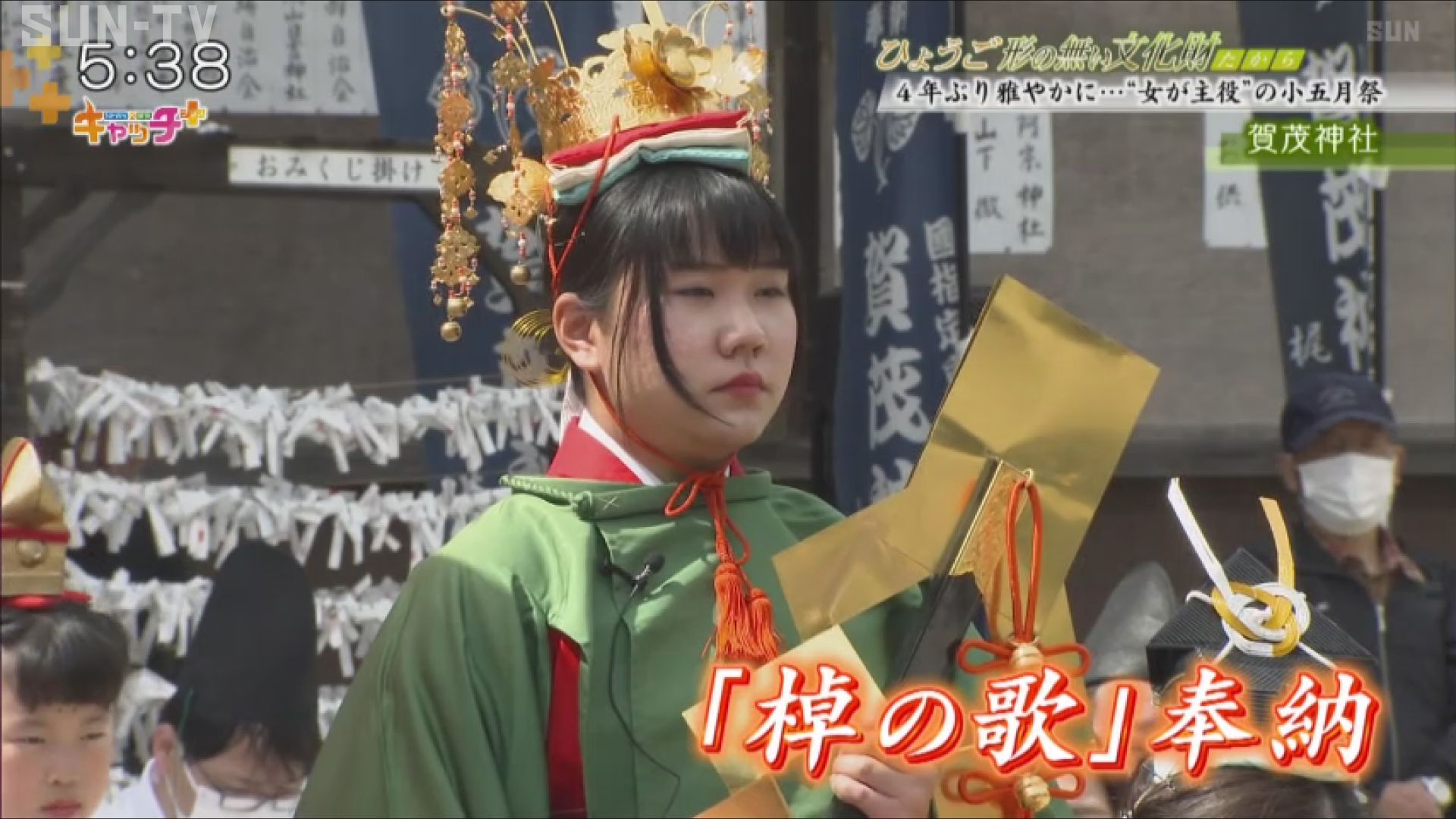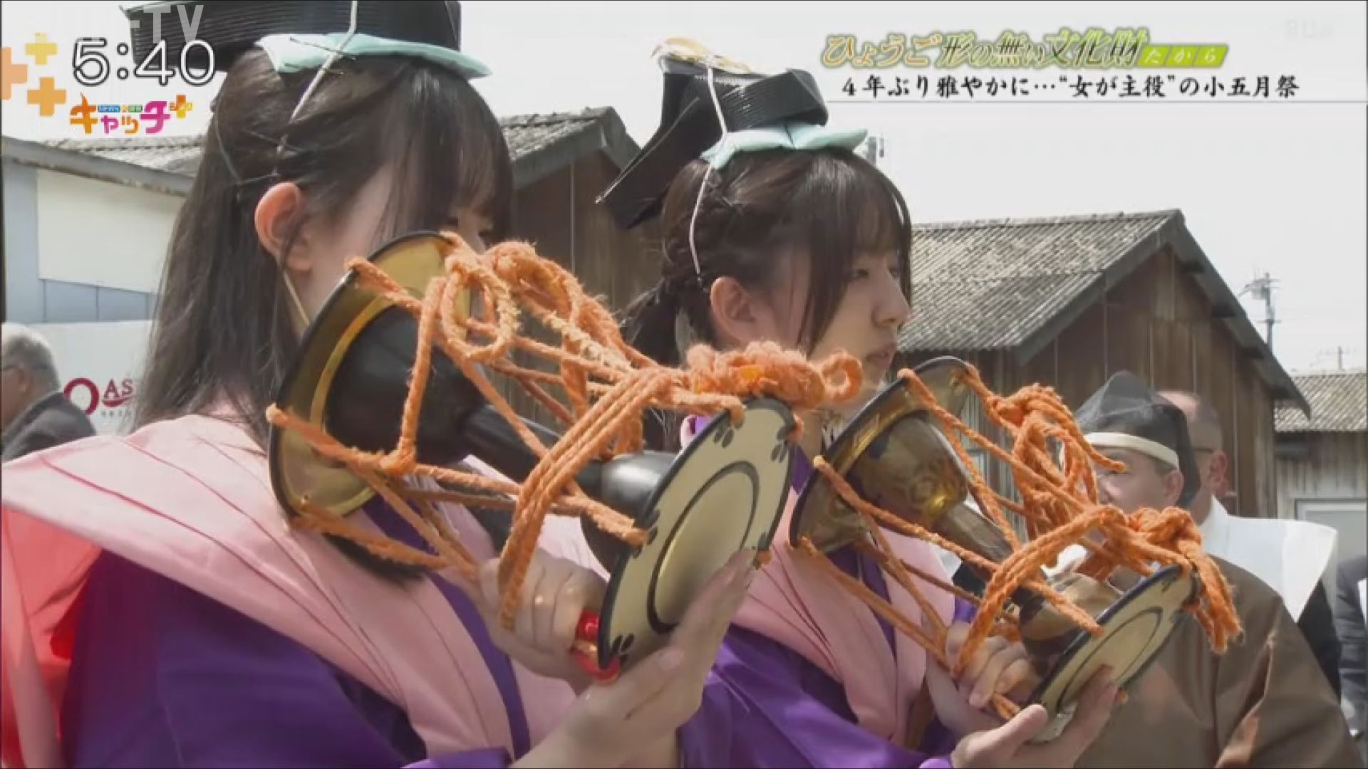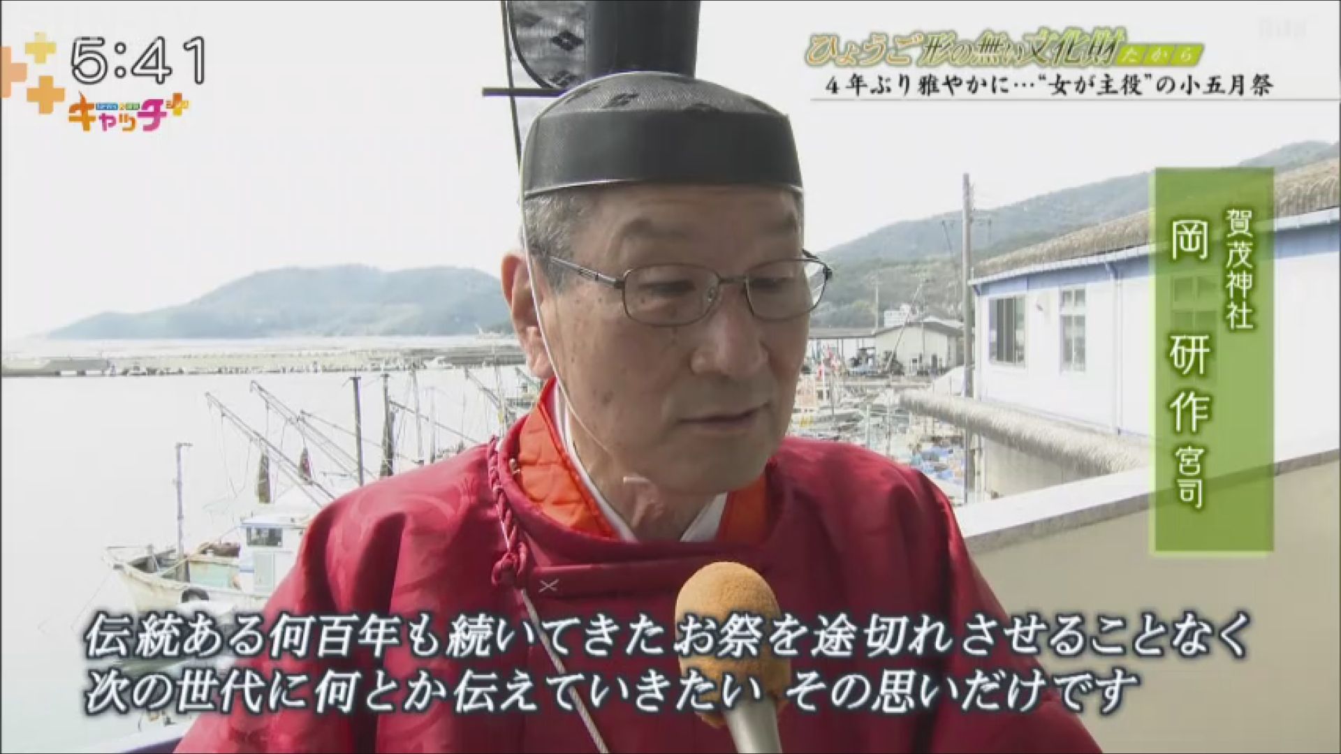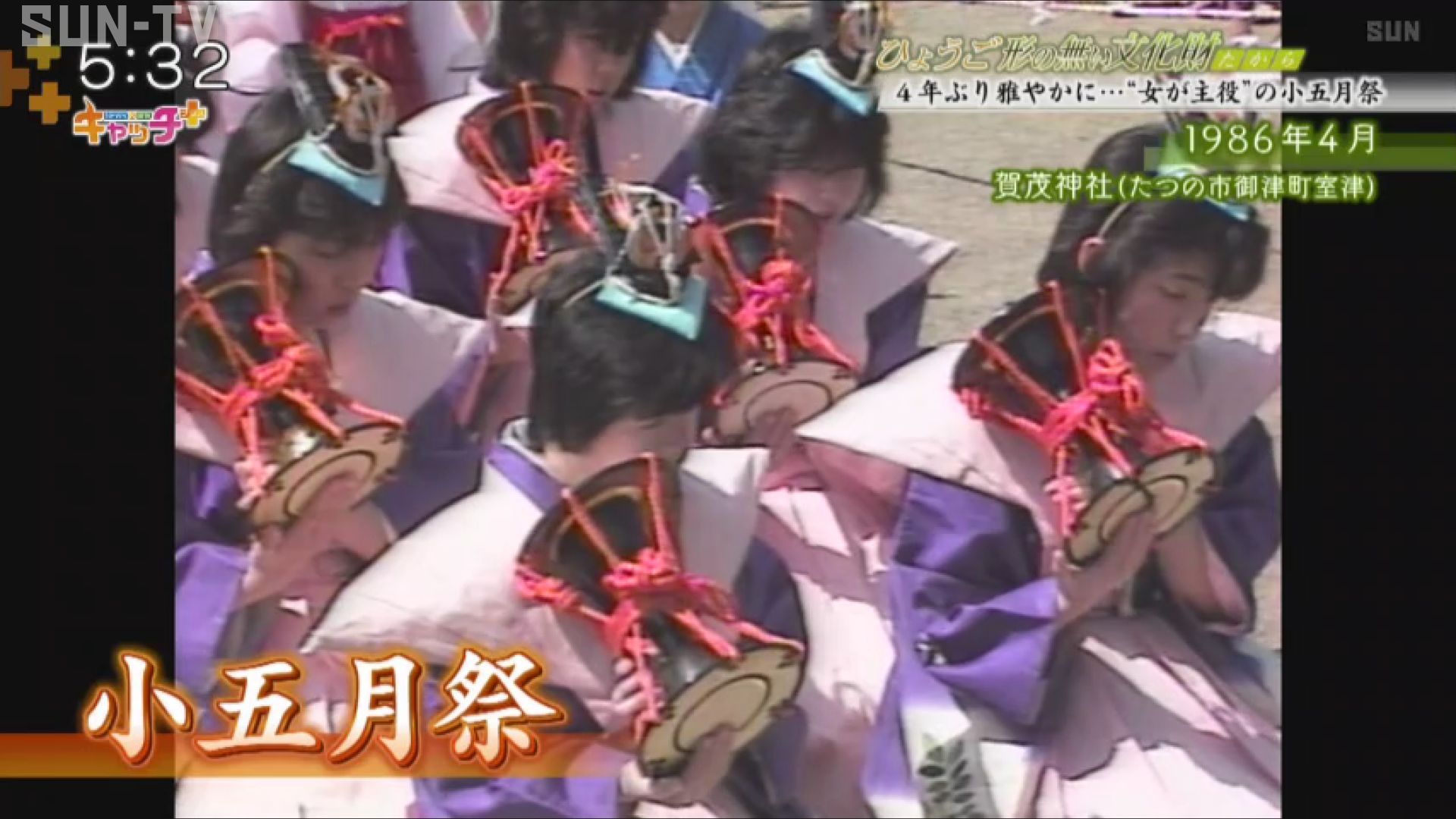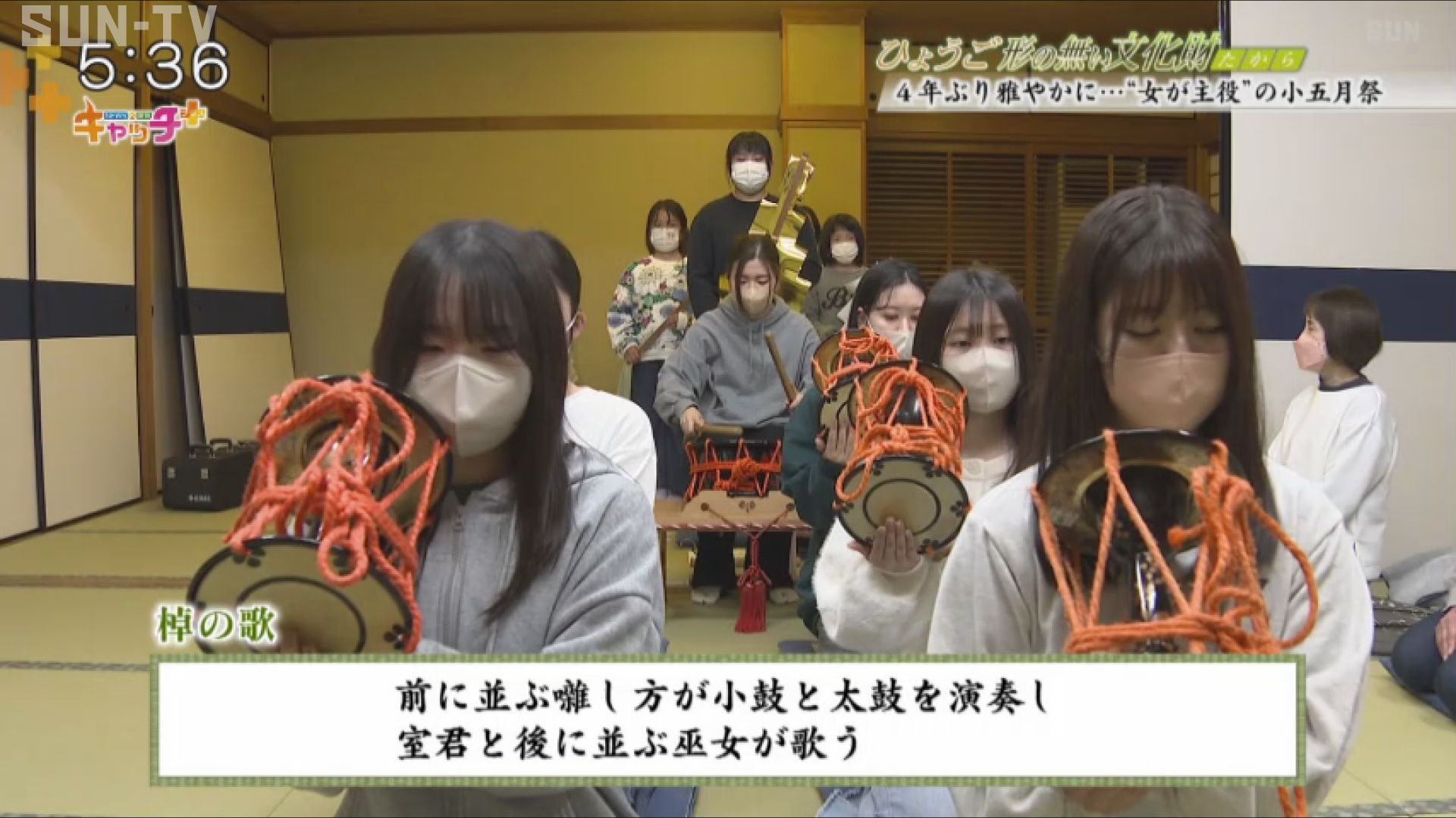 たつの市御津町の港町・室津の賀茂神社に伝わる「小五月祭」。毎年4月初めに行われる女の子の祭で、色鮮やかな衣装の女子高校生たちによって奉納されるのが、「棹の歌」です。