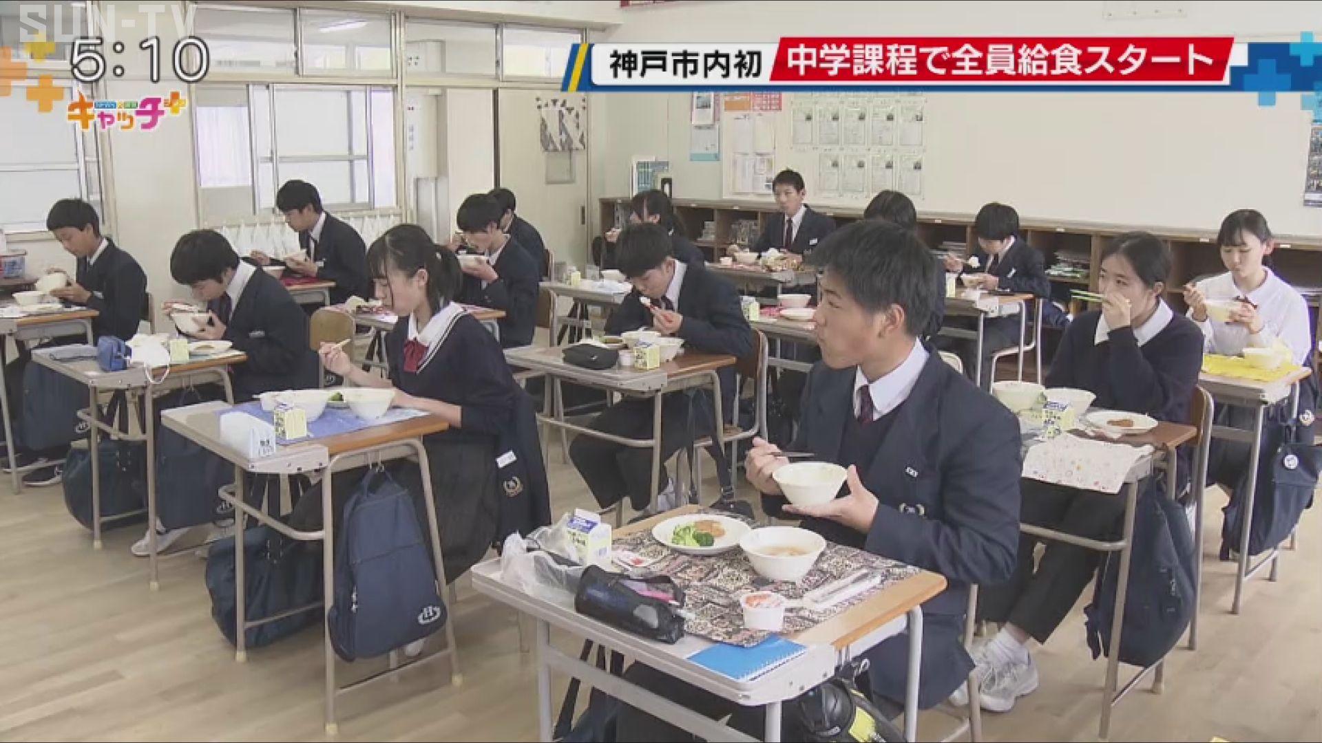 神戸市では現在、小学校は給食ですが、中学校は弁当と給食の選択制になっていて、「八多学園」では、小学生と同じ校舎に通うため、神戸市内で初めてとなる全員での給食が14日から始まりました。