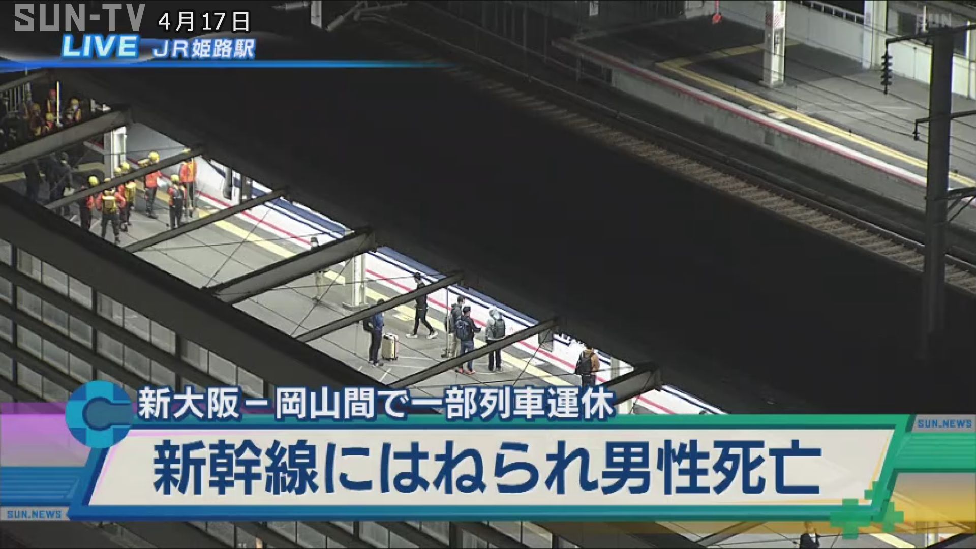 新幹線にはねられ男性死亡 新大阪ー岡山間で一部列車が運休 2023.04.1722:11 事件・事故 17日午後6時半ごろ、山陽新幹線の兵庫県姫路駅構内で、通過中の博多行き「のぞみ」に、男性がはねられ死亡しました。 JR西日本によりますと、午後9時過ぎに運転は再開されましたが、事故の影響で、新大阪-岡山間で一部の列車が運休しています。 #JR西日本 #人身事故 #山陽新幹線 記事のギャラリーを見る ニュース一覧へ戻る