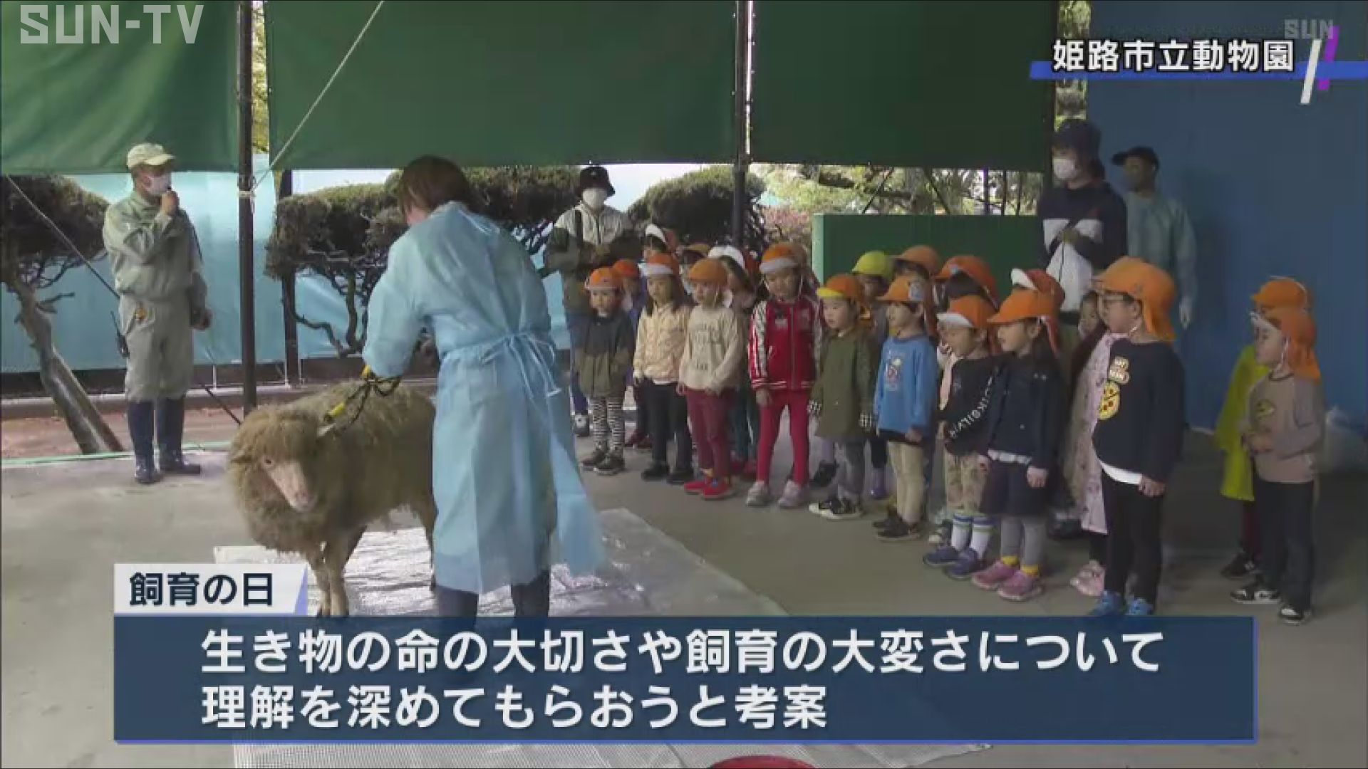 「飼育の日」は生き物の命の大切さや飼育の大変さについて理解を深めてもらおうと考案されたもので、姫路市立動物園では、地元の保育園児らを招きヒツジの毛刈りが披露されました。