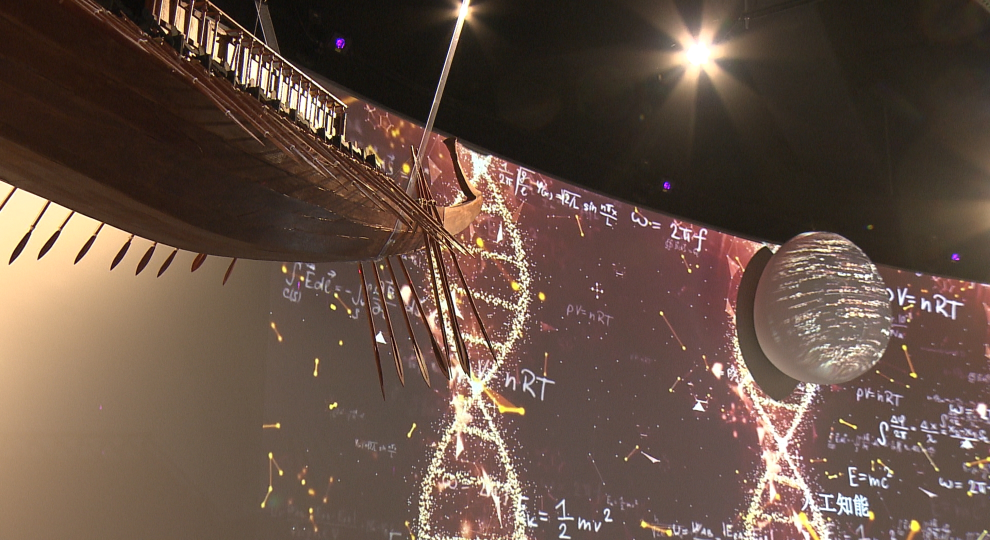 会場には、吉村さんが発掘したセヌウのミイラマスクや、クフ王の太陽の船などのレプリカが展示されている他、オリジナルのプロジェクションマッピングが投影され、古代エジプトの神秘とアクアリウムのコラボレーションを楽しむことができます。